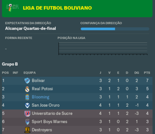 O campeonato boliviano é meio complexo de explicar, por isso fiz essa seçãozinha para explicar o complexo regulamento e ganhar tempo ao contar a história. Quando assumi o Blooming, o clube estava numa situação não muita boa. Com apenas 5 jogos realizados até então, havia sido eliminado já na Pré-libertadores pela equipe argentina do Velez Sarsfield e tendo feito apenas 4 pontos de 9 possíveis no campeonato local ocupava a metade da tabela da chave. Havia margem para crescer!. Embora houvesse saldo em caixa de 5,5 milhões de reais, o clube havia pago quase 1milhão só na minha rescisão, fora quase 4 milhões em dívidas de empréstimos/transferências a pagar. Mas a maior bomba de todas: Bonfante havia sido iludido e quase "caiu de costas" quando se encontrou com o Diretor de Futebol: o cara havia contratado o veterano Zé Wellison, um trintão por aprox. 35 a 44 milhões de reais. Alô Policia Federal! Alguém prende esse cara?