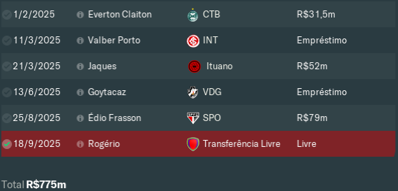 Foi um bom semestre de negociações. Chegaram 9 e saíram 9. Para mim a maior perda foi Duque, que já estava em negociações com o São Paulo.