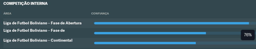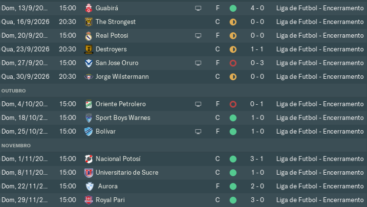 Eu estreei no clube na 4ªrodada com derrota em casa para o maior e mais popular  clube do país (Bolívar) testamos várias táticas (4-4-1-2MD / 4-4-1-1 assimétrico 2MD / 4-2-1-3 com pontas / 4-2-3-1 com 2 pontas e 2 volantes) e assim em 10 jogos conseguimos se recuperar rápido e fazer uma campanha razoavelmente boa.