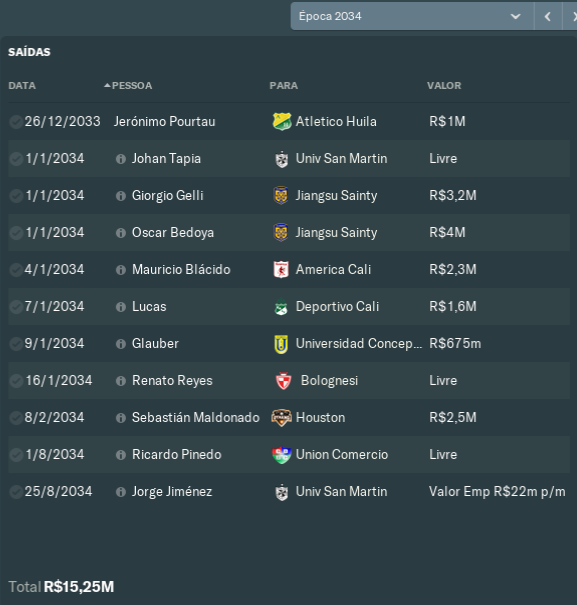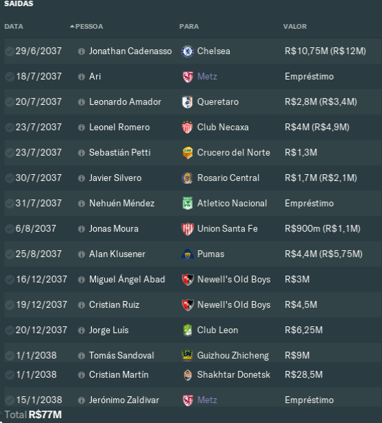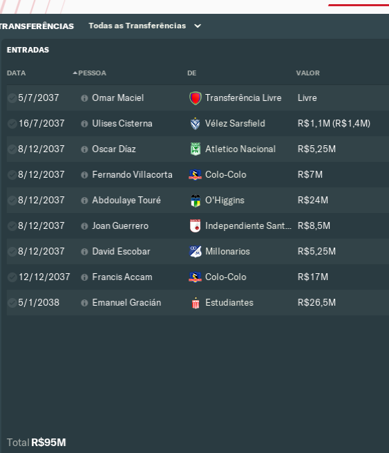 Chegadas: Outros 9 atletas chegaram a um custo de 95 milhões de reais, pois não estava facil negociar com rival e ex-clube. Omar Maciel, volante de 33 anos veio por estar livre mas não fui eu que pedi, por mim não viria. O goleiro Cisterna, ex- Velez é outra herança maldita, assim como o colombiano Oscar Diaz, ex-atacante do Atlético Nacional. Agora quem o treinador Bonfante trouxe: o seu lateral esquerdo de confiança ao menos para grupo Villacorta, ex- Alianza e ex-Colo-Colo com o treinador. Encontramos 2 prodigios colombianos polivalentes no ataque (Olha ai @ElPerroMG eu dando uma de Gallardo quem diria rs rs): Guerrero, ex- Independiente Santa Fé e Escobar, ex-Milionarios. Por fim a peso de ouro precisando bancar multas trouxemos o meia central costa-marfinense Touré ex-ASEC Mimosas e ex- O'hIGGINS ; o meia central ganês Accam dos meus tempos de Colo-Colo mas que começou no Hearts of Oak, e por fim o ex-zagueiro do Estudiantes Gracian