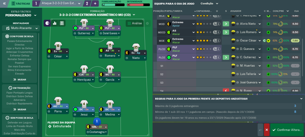 O Barcelona era o maior clube da carreira sem dúvida até o momento e estava com muita grana fruto da venda de jovens da base que tinham muito potencial e aliado as cinco contratações feitas antes da minha chegada eu fiz outras 5 contratações, sendo 2 laterais trazidos do Deportivo Tachira. Eu ainda fiz outras 5 saídas totalizando 16 saídas em definitivo ou empréstimos. Quase 50 milhões em saídas e quase 50 milhões em chegadas. Mas boa parte do investimento em reforços quando aqui cheguei.