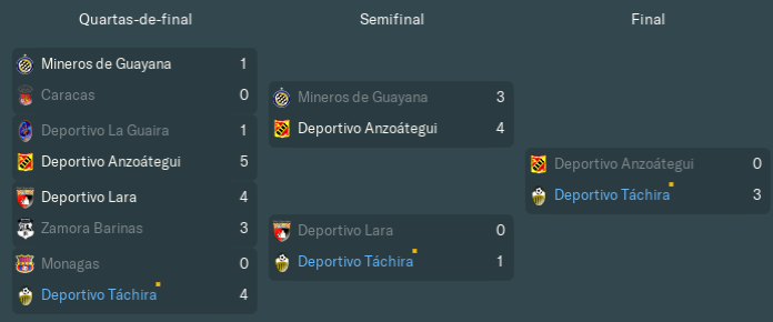 Tensão no jogo de ida em Barinas, com a equipe tachirense jogando muito mal. Situação que só se tranquilizou quando aos 68 minutos do segundo tempo no jogo da volta diante da nossa torcida Cristian Gutierrez soube ser oportunista para aproveitar rebote do goleiro e nos classificou para mais uma semi-final. Dessa vez pegaríamos o Anzoategui na semi-final