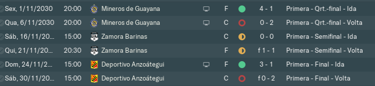Nas eliminatórias iriamos enfrentar uma das poucas equipes que não havíamos vencido até então: o Monagas o qual tivemos dificuldade de segurar o empate fora de casa na estreia da competição mas com a equipe mais encorpada mas dessa vez os pontas e os meias centrais funcionaram  e passamos para as semi-finais com duas boas vitórias. Na semi-final o caldo engrossou pois enfrentaríamos o atual campeão e super favorito ao título: Deportivo Lara.