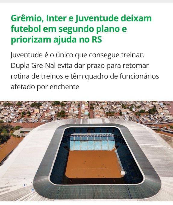 O Brasileirão é uma máquina de fazer dinheiro e movimentar massas. Não seria bacana ao invés de paralisar o campeonato, houvesse doações de alimentos nos estádios que Grêmio, Internacional e Juventude jogassem? Que parte da arrecadação dos valores pagos nos ingressos, fossem destinados às vítimas? O futebol é uma grande ferramenta para aliviar a situação em que o estado se encontra.
