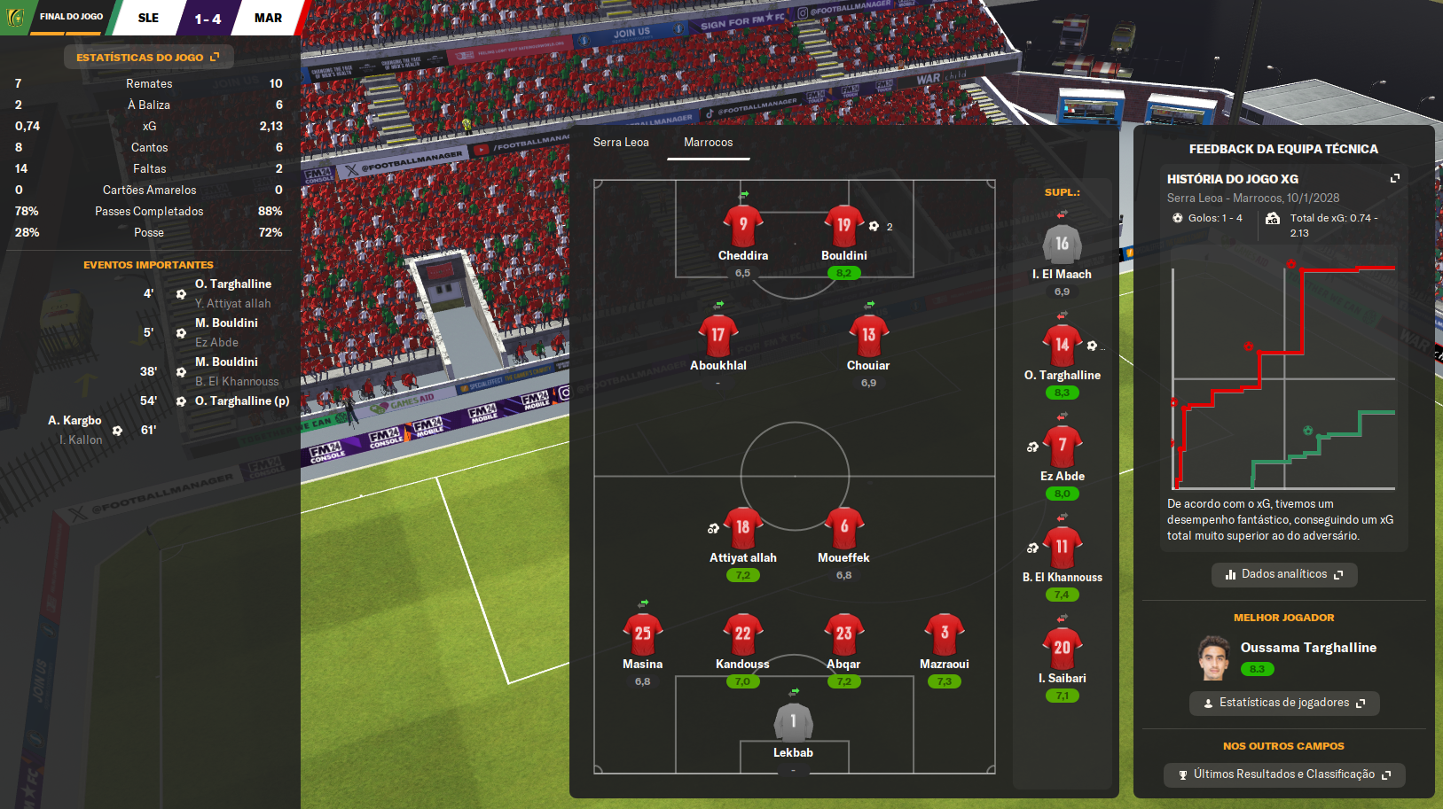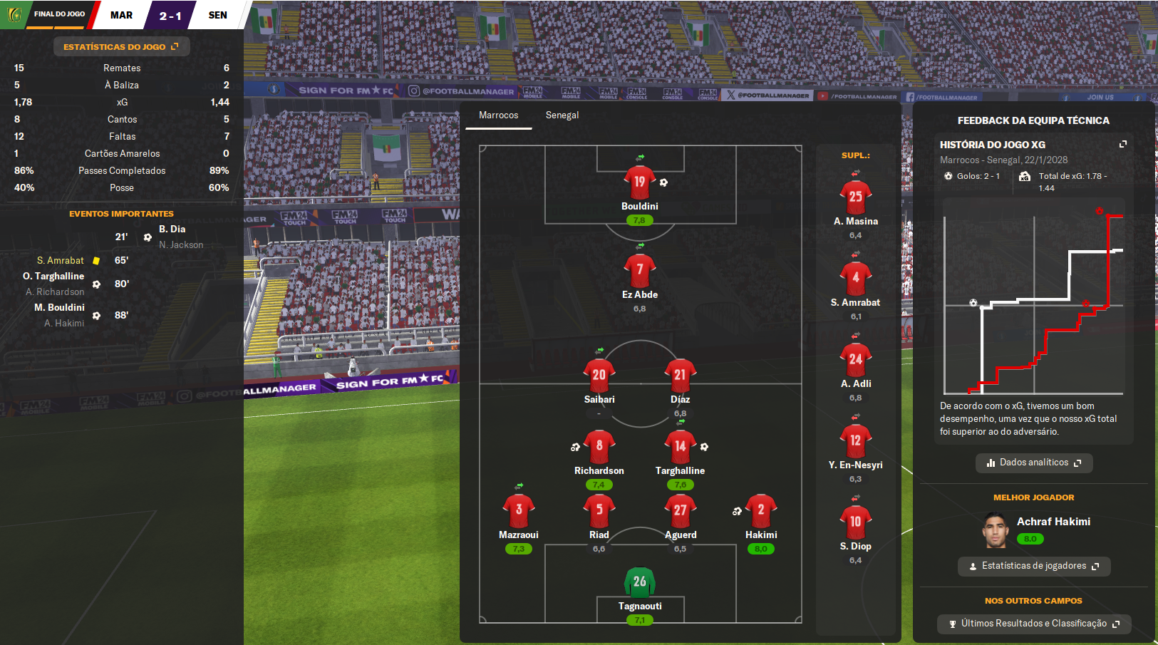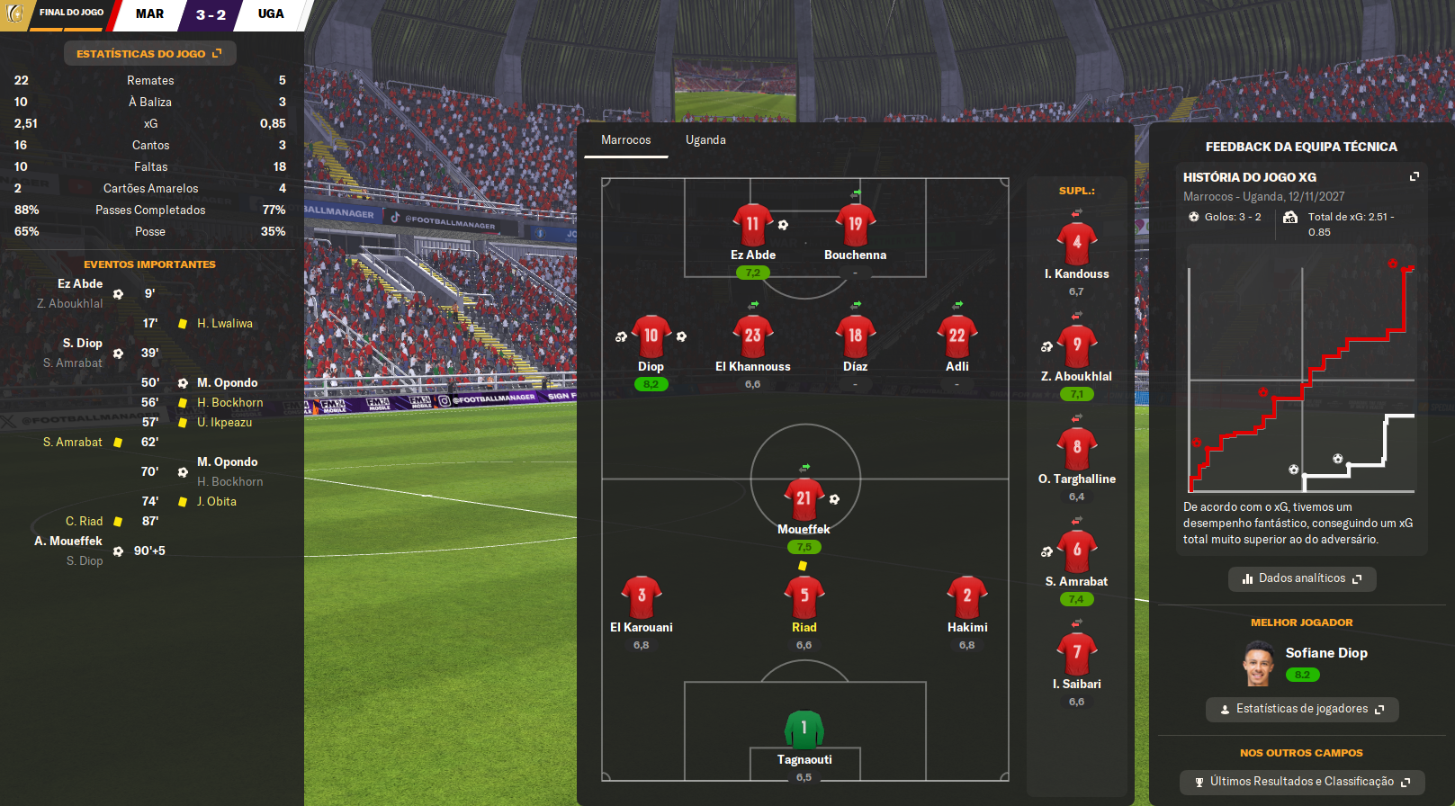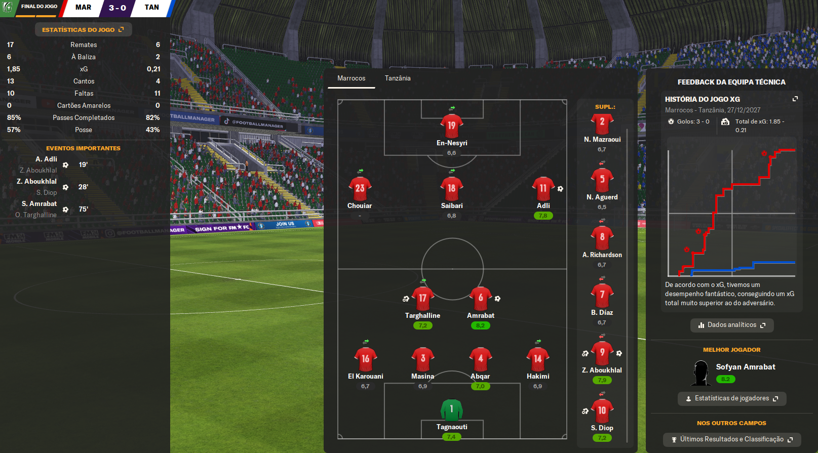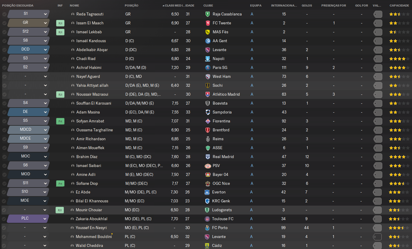 F J Postado 28 de Julho Autor Denunciar Postado 28 de Julho Convocação para a Copa Africana de Nações e amistoso preparatório Mantive os jogadores que mais chamei para a convocação e consegui convencer o En-Nesyri e o Mazraoui a voltar pra seleção (arrombados só pq era o CAN) e os 27 selecionados para a competição foram: No Amistoso contra a Tanzânia eu pretendia colocar o time titular mas o FM fez meus jogadores chegarem só no dia do jogo e alguns jogaram 1 e 2 dias antes então tinha alguns cansados e tive que fazer modificações, mesmo assim 3x0 sem sustos pra dar moral pro CAN A estreia no CAN é contra a rival Argélia. Citar