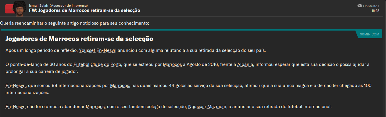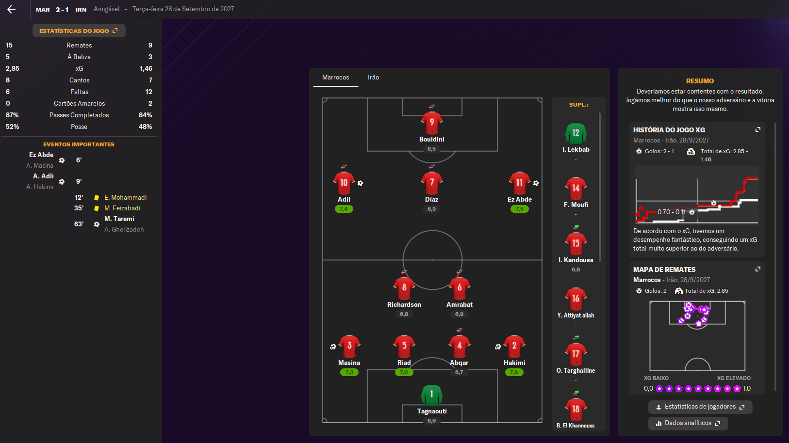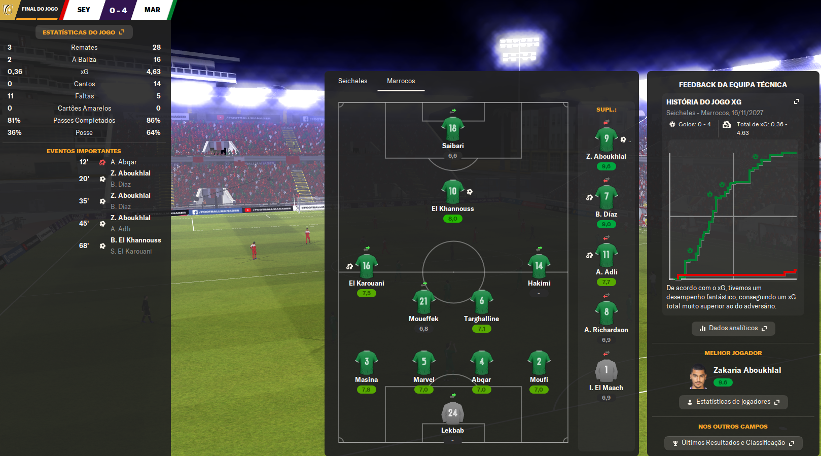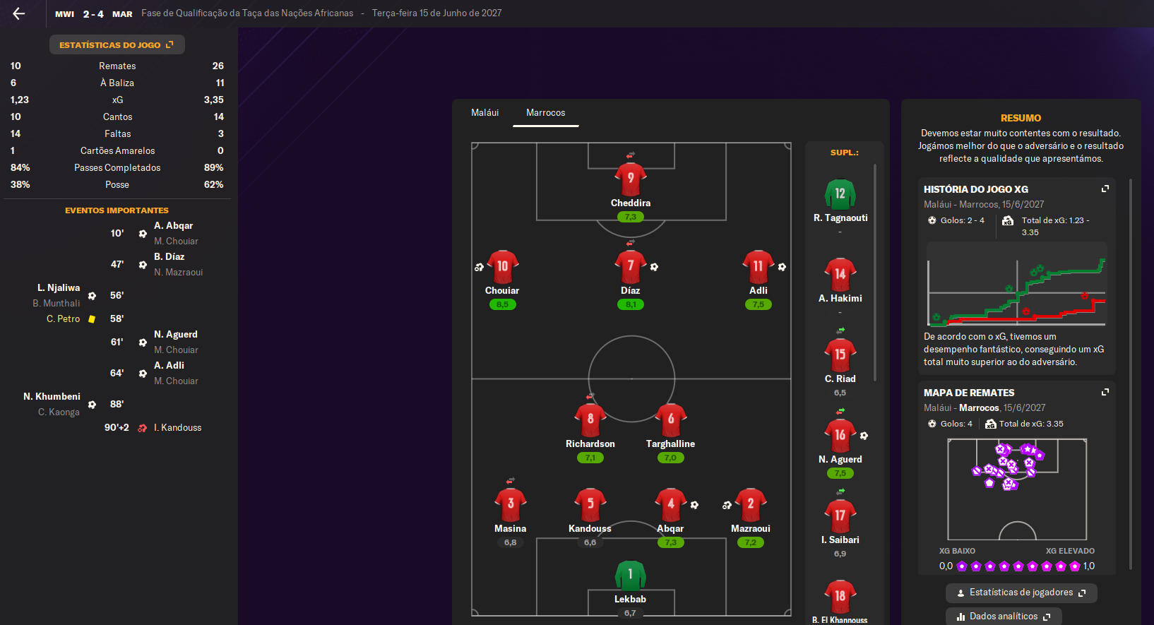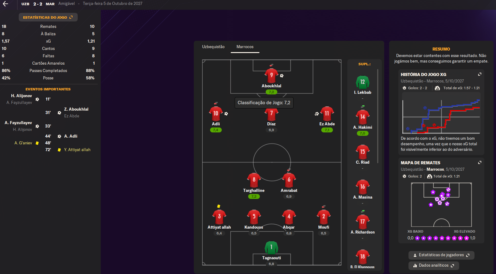 F J Postado 21 de Julho Autor Denunciar Postado 21 de Julho Perda muito importante e amistosos Antes de começar as datas FIFA tivemos um duro golpe, El-Nesyri com apenas 30 anos resolveu se retirar da seleção, simplesmente meu capitão e centro avante nivel Europa, essa doeu muito No amistoso contra o Irã resolvemos nos 10 primeiros minutos com dois cabeceiros, Bouldini que foi escolhido como substituto do El-Nesyri no ataque foi discreto, no segundo tempo Taremi (35 anos e na seleção, aprende El-Nesyri!) descontou pro Irã mas foi só isso, jogo cozinhado. 2x1 pra Nós No amistoso fora de casa contra o Uzbequistão fiz algumas trocas (algumas forçadas pelos clubes que queriam só 45 minutos pros jogadores) a linha defensiva foi toda reserva e o atacante Aboukhlal que convoquei pela 1a vez sob meu comando assumindo a 9. O Uzbequistão foi melhor, todos os gols no 1o tempo, Aboukhlal rendeu com um gol e o Adil fez um golaço de falta. No 2o tempo nos primeiros 15 minutos chegamos mais nas bolas paradas e depois o Uzbequistão teve mais volume de jogo mas sem chegar a assustar, 2x2 Agora teremos na proxima data FIFA jogos teoricamente faceis contra Uganda e Seychelles pelas eliminatórias africanas e logo no começo de 2028 o maior torneio africano a Taça Africana das nações e provavelmente antes faremos um amistoso contra uma equipe africana (estou decidindo se pego uma de nivel parecido com a Argelia que está no nosso grupo ou algum saco de pancada pra dar moral) Citar