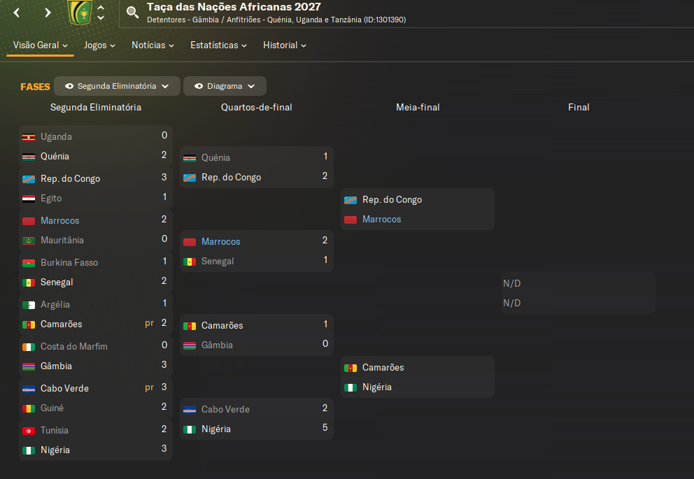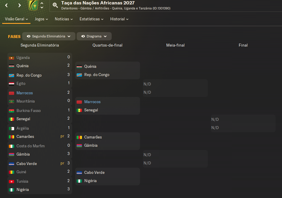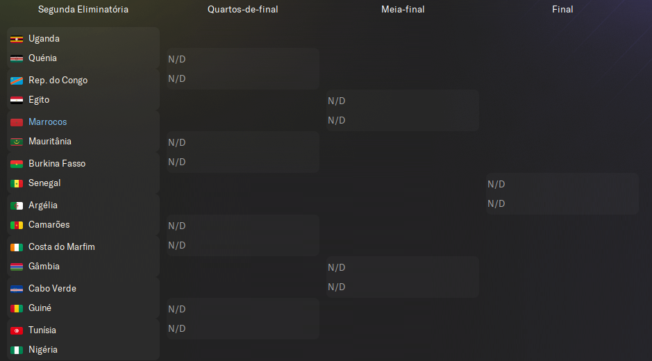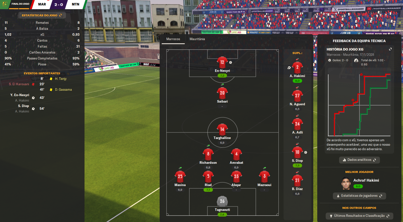 F J Postado 31 de Julho Autor Denunciar Postado 31 de Julho Vitória nas oitavas de final sem sustos Nas quartas de final contra a Mauritânia entramos como favoritos mas aos 23 o El Kararaouni foi expulso deixando o trabalho mais dificil, mudei o time pra jogar para as bolas paradas e botei o Hakimi com 3o zagueiro aberto. Numa cobrança de falta do Hakimi o En-Nesyri fez de cabeça. A Mauritania mantinha a posse mas sem incomodar, no começo do segundo tempo um bolão do Hakimi pro Diop e 2x0, depois disso coloquei outro lateral esquerdo e fiz uma linha de 4 e fui recuando o time e cozinhando o jogo, Mauritânia não assustou e ainda consegui poupar os amarelados. Um jogaço do Hakimi, estamos nas Quartas da Taça Africana de Nações! Assim ficaram as Quartas de Final: Citar