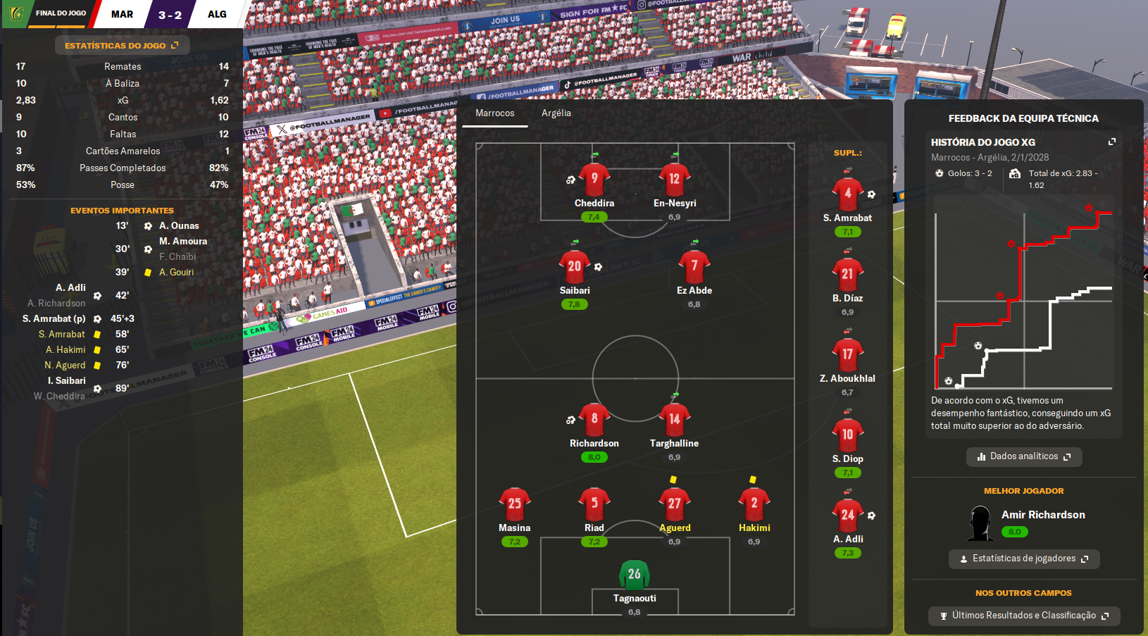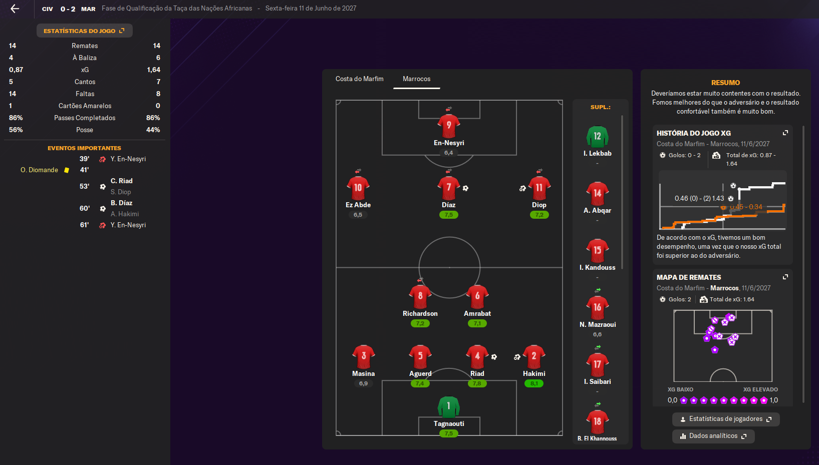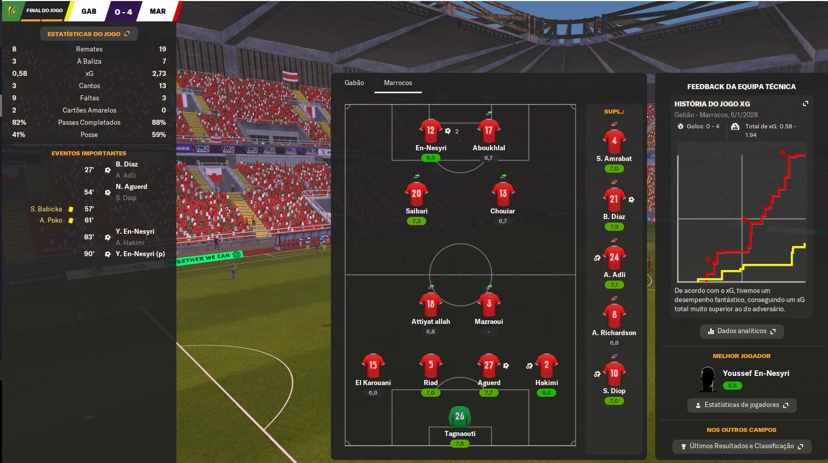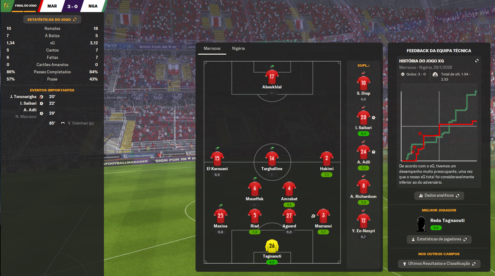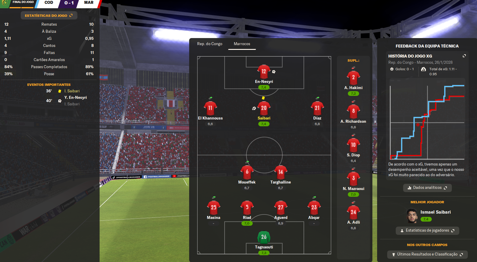 F J Postado 2 de Agosto Autor Denunciar Postado 2 de Agosto Marrocos é finalista da Copa Africana das Nações! Em um jogo morno com poucas chances de ambos os lados, a Republica Democratica do Congo começou melhor e explorando meu flanco esquerdo onde eu jogava com um lateral invertido, apos mudar a função pra defesa lateral "normal" equilibramos o jogo e com uma bolaça do Saibari pro El-Nesyri fizemos o gol da vitoria. O Segundo tempo aconteceu pouca coisa, cozinhamos o jogo e o RDC não chegou com perigo nem nos, como as estatisticas mostram, Vamos pegar a Nigéria de Osimeh que está jogando muito no torneio na final. Citar
