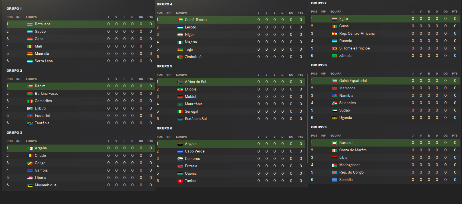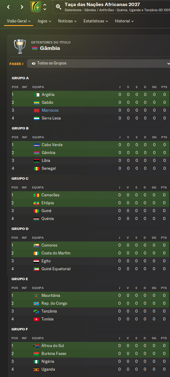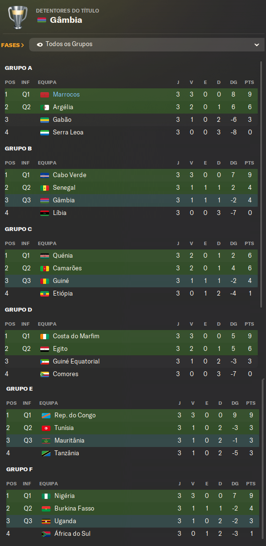 F J Postado 30 de Julho Autor Denunciar Postado 30 de Julho Classificação com 100% de aproveitamento Primeiro jogo contra os rivais da Argelia, no primeiro lance do jogo o Aboukhalal quase abriu o placar mas o Luca Zidane (sim o filho do Zidane) defendeu, estavamos melhor no jogo e ai o cara da Argelia acerta um tirambaço pensei mais um dia daqueles, logo 2x0 pra eles... botei o time mais pra frente e apertei a marcação, consegui diminuir perto do fim e nos acrescimos um penalti, 2x2 fomos pro segundo tempo tudo igual, Segundo tempo Argelia melhor nos primeiros 15 minutos , tirei uns cansados, demos uma igualada mas eles melhores, aos 76 coloquei Cheddira e Saibairi e mudei pra 4-2-2-2 e num contra ataque com passe de um e gol do outro viramos, espetacular 3x2 de virada nos rivais pra começar bem o CAN! Segundo jogo sem sustos, dominamos completamente o Gabão e goleamos por 4x0, aproveitei pra descansar jogadores no 2o tempo e fazer testes taticos, parece que o time funciona bem no 4-2-2-2 e é uma bola alternativa tatica. Com o resultado garantimos o 1o lugar do grupo antecipadamente pelos critérios Pro Jogo com Serra Leoa já classificados em 1o resolvi escalar o time totalmente reserva, com 5 minutos ja estava 2x0 e ganhamos de 4x1 sem sustos Os grupos ficaram assim: Pegaremos a Mauritânia nas oitavas, um adversário bem acessivel: Citar