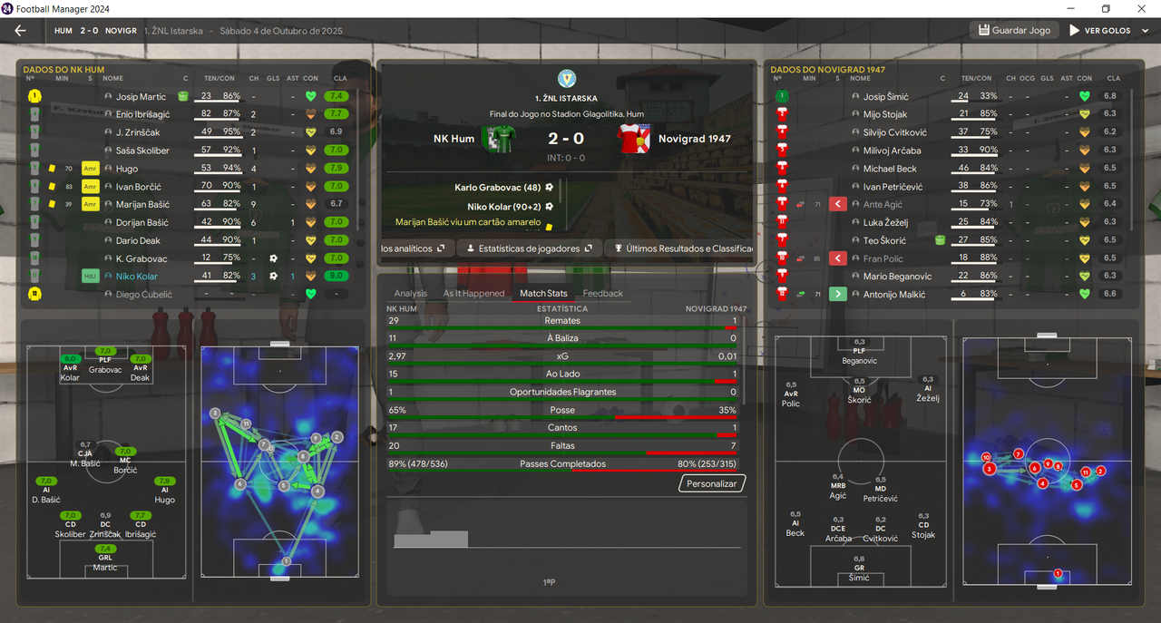 Mas aos 30 num contra-ataque nas costas do ala esquerdo, a equipe da casa abre 1x0. O ímpeto deles já mostrava que era pra estar 2. Pvrak tenta acalmar o time que segue sofrendo uma avalanche de ataques adversários. O segundo tempo começa com o Hum pressionando e Kaurin força a zaga adversária a cometer o mesmo erro que o Istra, mas a finalização termina na trave. Aos 35 do segundo tempo, numa falha de posicionamento da zaga, o centro avante adversário entra no meio dos zagueiros e completa na saída do goleiro. 2x0. Aos 38, Kaurin coloca mais uma bola na trave, mas já era tarde demais.