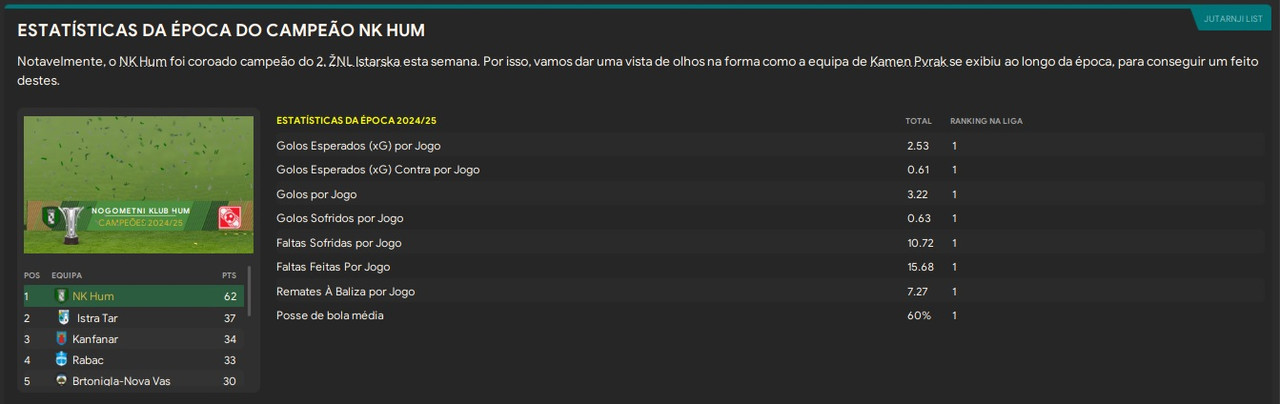 A lenda diz que os gigantes construíram Hum com as pedras que sobraram de outras cidades. Séculos depois, outro gigante — desta vez, de chuteiras — começa a escrever seu capítulo na história. O NK Hum, clube da menor cidade do mundo, acaba de conquistar a 3. ŽNL Istarska, a primeira divisão regional da Ístria, e coloca a primeira pedra de uma jornada que mira a elite do futebol croata.