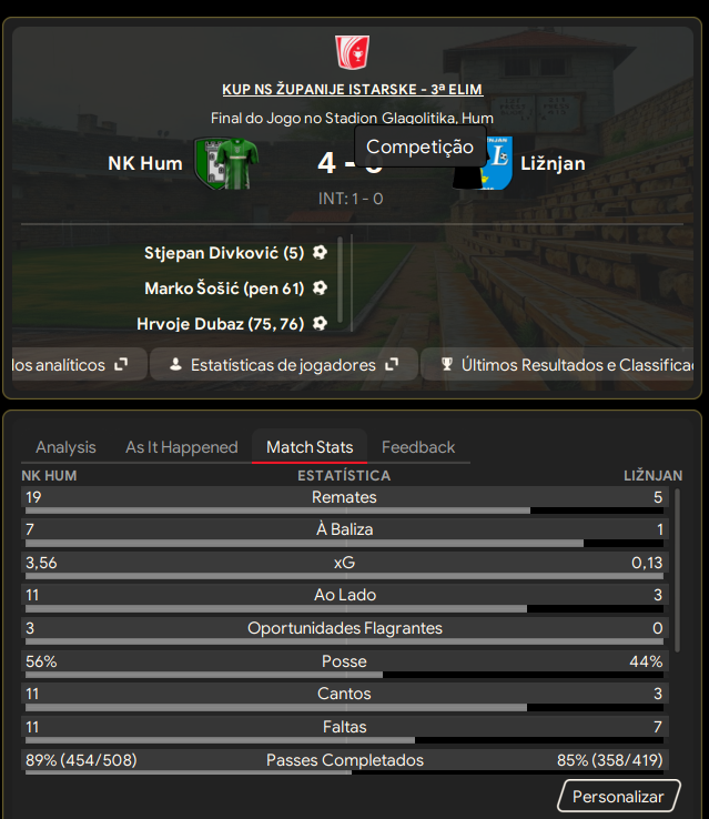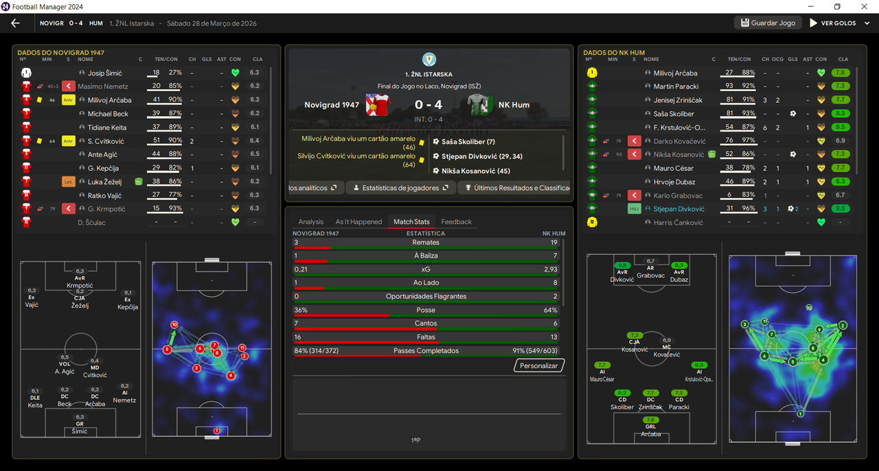 Foram 17 remates dos Divovi contra 5 dos donos da casa e apenas 1 no alvo. Um Xg de 1,83 contra 0,26; 62% de posse de bola e 87% de passes completados foram suficientes para Marko Socic e Ivan Kaurin, em apenas 4 min, colocarem seus nomes e o do Hum na história.