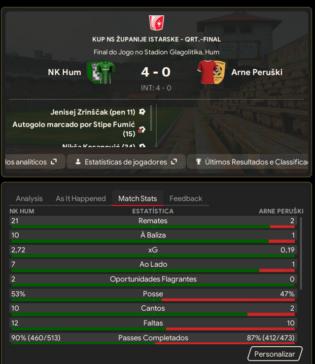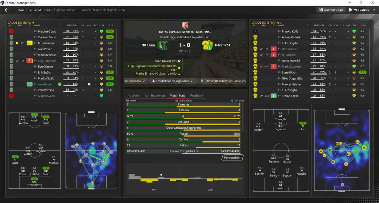 Aos 17 min do segundo tempo cal pros donos da casa. Sosic que tinha voltado chama a responsabilidade...bola pra um lado...goleiro pro outro! 4x1. Roubada de bola de Divkovic (Avançado recuado de apoio), jogada indivisual de Sosic (Ponta de lança) e gol de Kosanovic (CJA). 4x2 aos 21 do segundo! Kosanovic (o melhor em campo até o momento sai lesionado) sem a opção de outro CJA, Kamen coloca Rodrigão em campo (MC) como mezzala de ataque e altera o MRB para outro Mezzala e a equipe passa a controlar o meio. "TRIIIIIIINTA...TRIIIINNNTA E CINCO JOGADOS, DEZ POR JOGAR...."cruzamento no segundo pau e...4x3! A euforia toma conta do Stadion Glagolitiko...Os 485 torcedores (em sua maioria turistas do pacote da Ziva Istra) não acreditam no que estão presenciando e passam a torcer pelo Hum como se fossem seu próprio time...a pressão é absurda! 45 do segundo...chuveirinho na área é lixo...falta na esquerda...cobrança no segundo pau...goleiro na área (o protocolo desespero estava ativado). Essa bola encontra a cabeça de Dubaz que a centra pro meio da área, ela encontra a cabeça de Basic que cabeceia no travessão...só que o impossível acontece e ela sobra livre nos pés de Rodrigão que empata a partida aos 45:07. O impossível aconteceu! O improvável empate ocorreu no último minuto possível e o estádio veio abaixo! Vem a prorrogação! Jogadores cansados, mas a moral lá no céu! E logo aos 11 do primeiro tempo da prorrogação, Dubaz desempata de cabeça! 5x4 pros Gigantes de Hum! Uma vitória de raça, uma vitória de verdadeiros gigantes! O Hum estava novamente na final da Copa Regional da Istra!