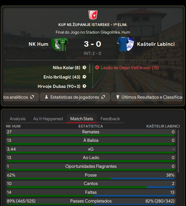 Ninguém acreditava no que acabara de acontecer, mas tava lá! NK Hum 1 x 0 NK Istra. A equipe da primeira divisão parece ter sentido o gol e não conseguiu mais se impor no jogo. Kamen pedia atenção a todo minuto para seus comandados e aos 52 min do segundo tempo, o árbitro apita para colocar o Hum na sua primeira final de Copa! Ainda era possível sonhar.