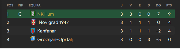 Até o presente momento, o NK Hum jogou uma espécie de "estadual", onde enfrentrou times do Condado da Istría e ele foi amplamente dominante, como vc poderão ver a seguir.
