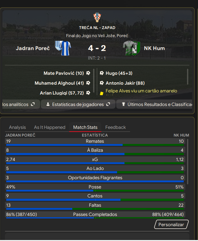 2️⃣ - LIDERANÇA PRECIPITADA - Os 13 pontos (3x0 no Rovinij; 2x0 no Medulin 1921; 3x1 no Crikvenica, 3x3 contra o Rudar Lubin e 1x0 no Grobnican) alcançados nas 5 primeiras rodadas colocaram a equipe na liderança da competição de maneira precoçe! Enquanto isso, o favorito ao título também fazia a mesma caminhada. O Hum enfrentou o Jadran Porec no Veli Joze e tomou um sonoro 4x2. O time que, sempre que assumiu a liderança nunca a perdeu, parece ter sentido o baque e não se recuperou.