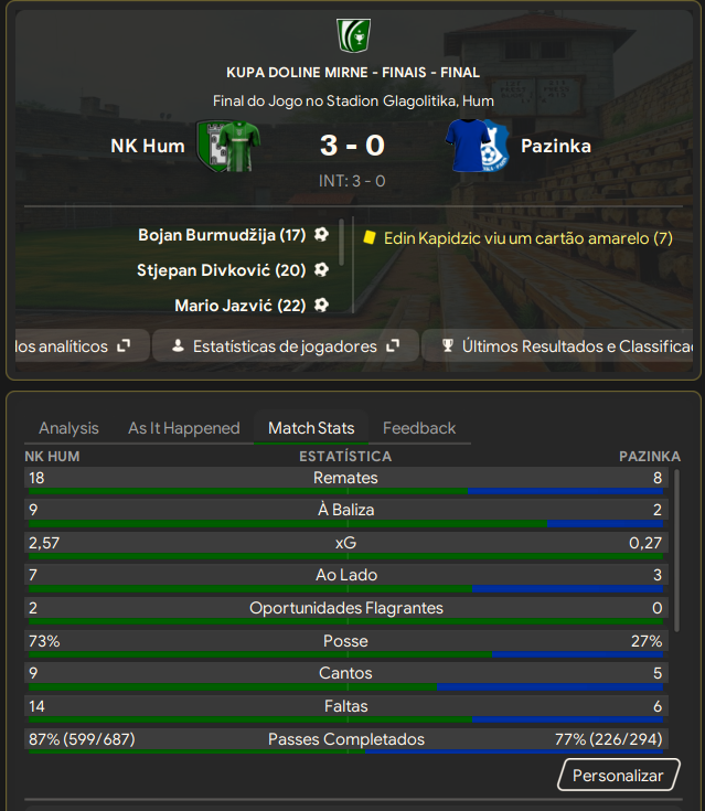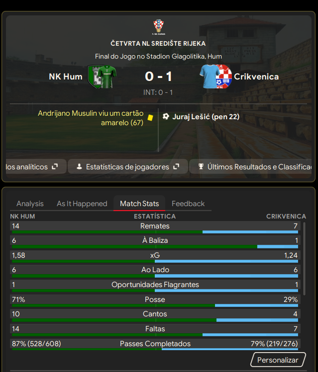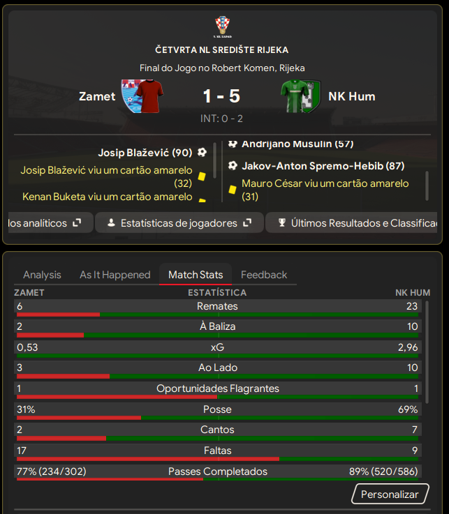 Aos 18 ainda da primeira etapa, o time visitante empata com um balaço dentro da grande área e aos 02 da etapa final, Lezenic completa para o gol dentro da pequena área e vira o jogo. Mais uma vez o NK Hum não passa da primeira fase da Copa da Croácia.