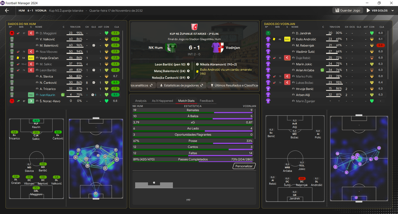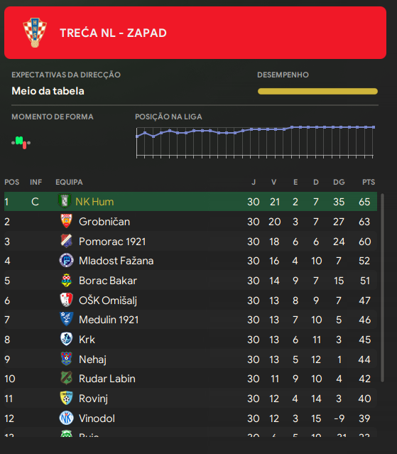 A estreia, contra o Vinodol, trazia à tona a dor de cabeça da temporada que tinha acabado, a zaga! Aos 35m da primeira etapa, os donos da casa já ganhavam por 3x0 com apenas 4 chutes no alvo, outra memória desbloqueada, o goleiro. Aos 42, ainda do primeiro tempo, em uma bola loga da defesa para o ponta direita, Rafael vai no fundo de cruza rasteiro para o outro estreante da tarde, Salkic (MOC) que diminui o placar. 3x1! Salkic, base do rival Istra 1961, é o típico meia armador que corre o jogo todo e em um combate no meio, rouba a bola do adversário, toca em Josip Kolar (que herda, temporariamente, a vaga de 9) que vê Rafael entrando sozinho na ponta (avançado interior) e marca. 3x2. Kolar empata de pênalti aos 29 min do segundo tempo. Lembram de Musah? Sim, o artilheiro do time na temporada 28/29. Ele também voltou ao time após passagem apagada no 07 Vestur, das Ilhas Faroe. Musah completa escanteio no primeiro pau e VIRA A PARTIDA!!!! 4x3 e 3 pontos, incríveis, para os Divovi.