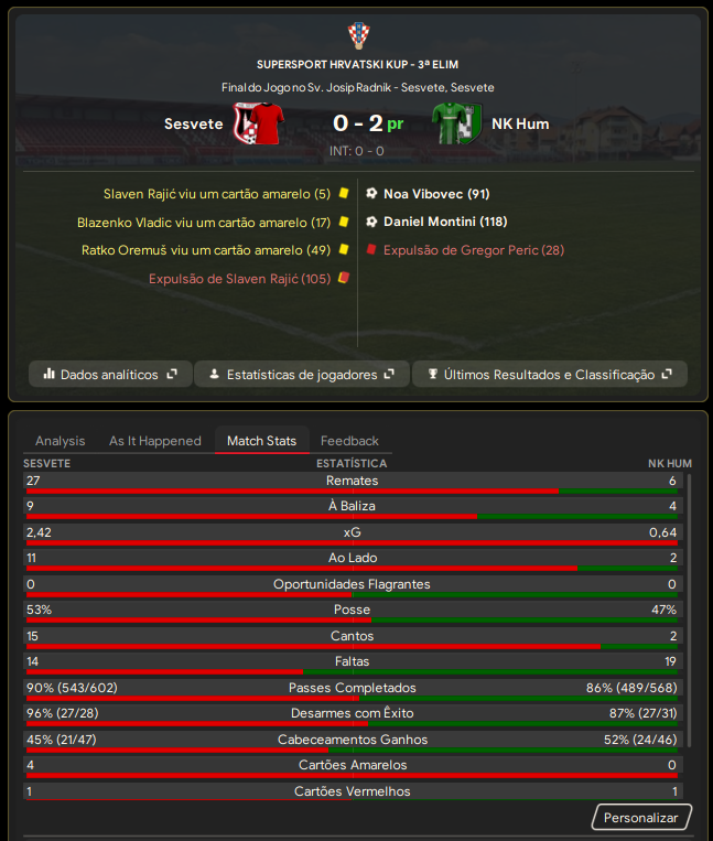A primeira chance é dos donos da casa, após contra ataque de uma falta mal batido pelo Hum, Kamissoko completa de fora da área. O Hum responde, no lance seguinte, com uma cabeçada no primeiro pau, após cobrança de escanteio. A partida segue com muitos chutes ao largo, pouca assertividade. Pvrak muda! Tira o time do 4-2-3-1 para um 4-4-1-1, povoa o meio campo e, aos 45 da etapa final é presenteado com um gol de pênalti, após Summer ser empurrado na área adversária. Barisic na bola, goleiro pra um lado, bola pro outro! 1x0 Hum...um pé na segundona!!! 49 do segundo tempo, escanteio pro Sesvete! Bola na área...1º pau...desvio do zagueiro adversário...Leo Tolic tira em cima da linha...tronco a frente para a segundona.