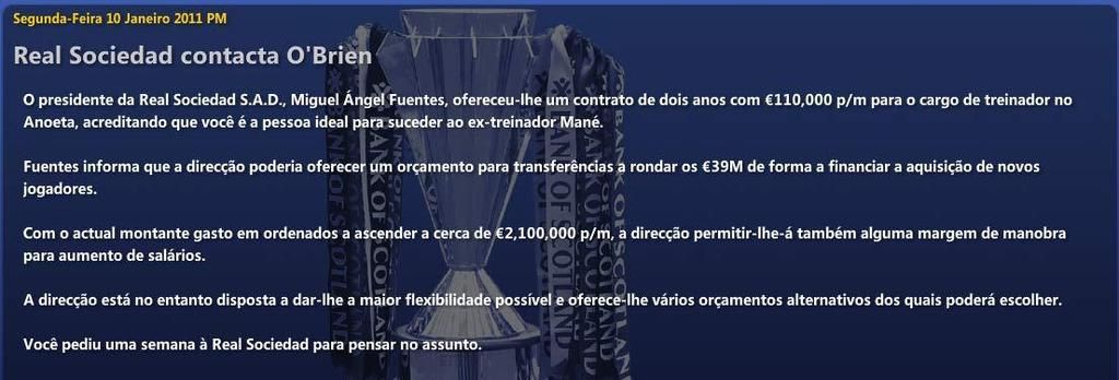 GG. Postado 18 de Junho 2006 Autor Denunciar Postado 18 de Junho 2006 10 de janeiro de 2010O’Brien é o alvo da Real Sociedad Treinador escocês recebe oferta de contrato Todos sabem que os treinadores estrangeiros estão em alta na Espanha. Dos cinco primeiros colocados da 1ª Liga, apenas o treinador do Sevilla, Irueta, é espanhol. Os demais são todos estrangeiros. No líder Real Madrid, o escocês Alex McLeish dá as cartas; no Athletic Bilbao está o holandês Frank Rijkaard; no Valencia, o italiano Cláudio Ranieri e no Barcelona, outro escocês, Gordon Strachan. E pelo jeito, mais um clube espanhol quer mais um treinador estrangeiro e escocês para dirigir seu plantel. A Real Sociedad, 10ª colocada, ofereceu um contrato de trabalho a John O’Brien, treinador do Queen’s Park, depois de demitir o espanhol Mané. O contrato teria a duração até junho de 2013 e O’Brien receberia um salário de 110 mil euros por mês. Caso aceite, O’Brien também teria um orçamento de 39 milhões de euros para contratações e uma orçamento salarial de 2,4 milhõs de euros. Nas últimas temporadas a Real Sociedad vem amargando posições medianas na tabela e o presidente do clube, Miguel Angel Fuentes vê em O’Brien a pessoa certa para tirar o clube dessa situação e levá-lo a um futuro melhor e com títulos, já que o último conquistado foi a Copa do Rei 2007/08. O veterano Nihat ainda é o grande nome do time, mas o clube tem outros bons jogadores, tais como, veteraníssimo goleiro holandês van der Saar, o também holandês, van Bommel, o belga Vanden Borre, o macedônio Goran Pandev, e os brasileiros Kerlon e Thiago Ribeiro. O’Brien afirmou que analisaria a oferta com cuidado e pediu o prazo de uma semana para dar um posicionamento. O treinador do Queen’s Park já afirmou em outros momentos que não se sentia preparado para deixar a Escócia e enfrentar outros desafios. Perguntamos, por telefone, se ele não achava que depois de conquistar a Copa UEFA e a Supercopa Européia não seria o momento de ampliar sua experiência como treinador, mudando-se para outro país. Ele nos respondeu que poderia ser e que ele não tinha certeza de nada, mas fez questão de lembrar que Sir Alex Ferguson, depois de conquistar dois títulos europeus com o Aberdeen, permaneceu no clube por mais três temporadas e que talvez esse ainda não seja o momento de deixar o Queen’s Park e a Escócia. Elenco: Por favor, opinem. Devo continuar aguardando algo na Inglaterra ou faço um desvio de rota e vou para a Espanha? Citar