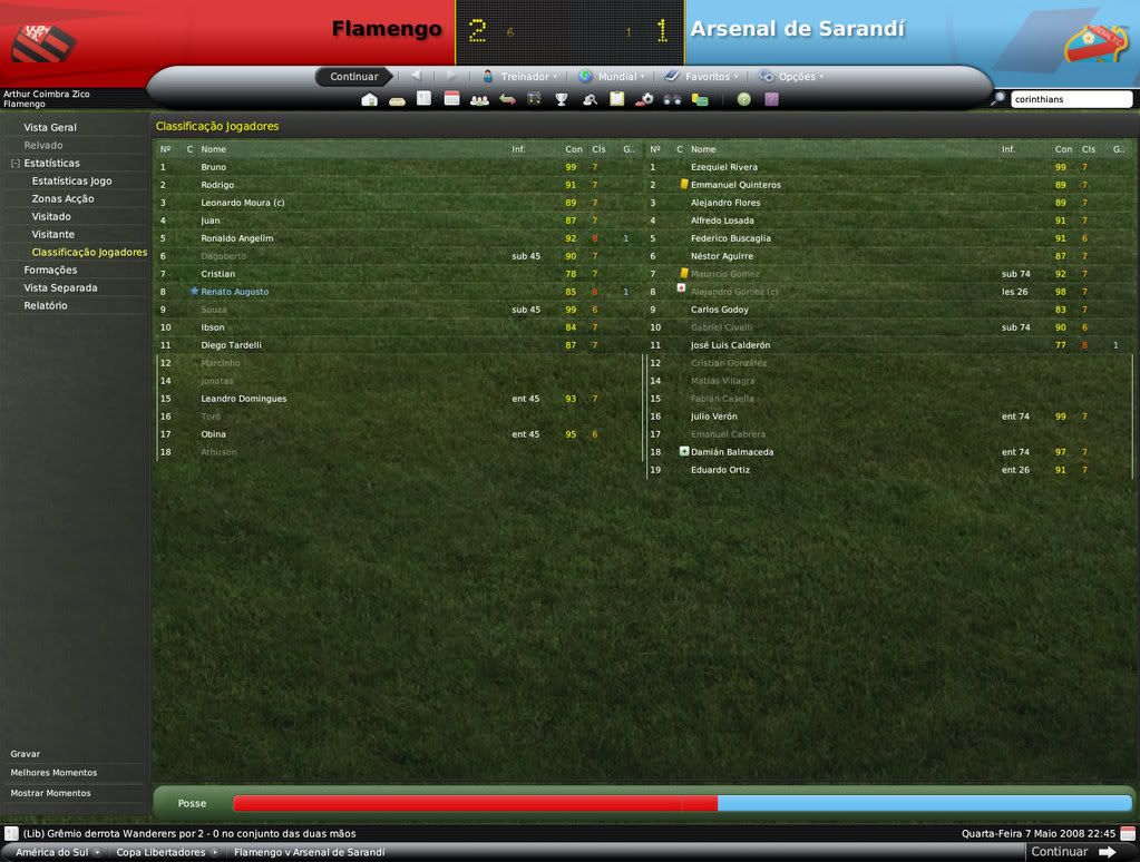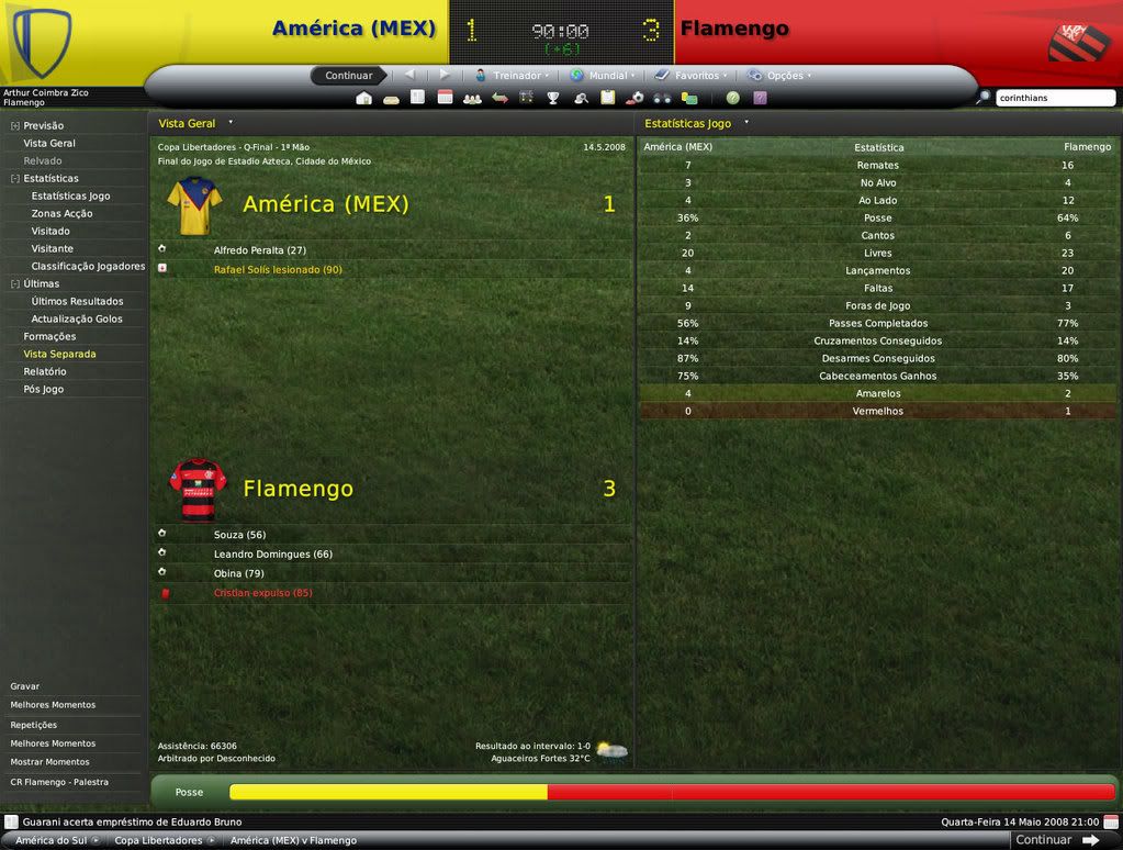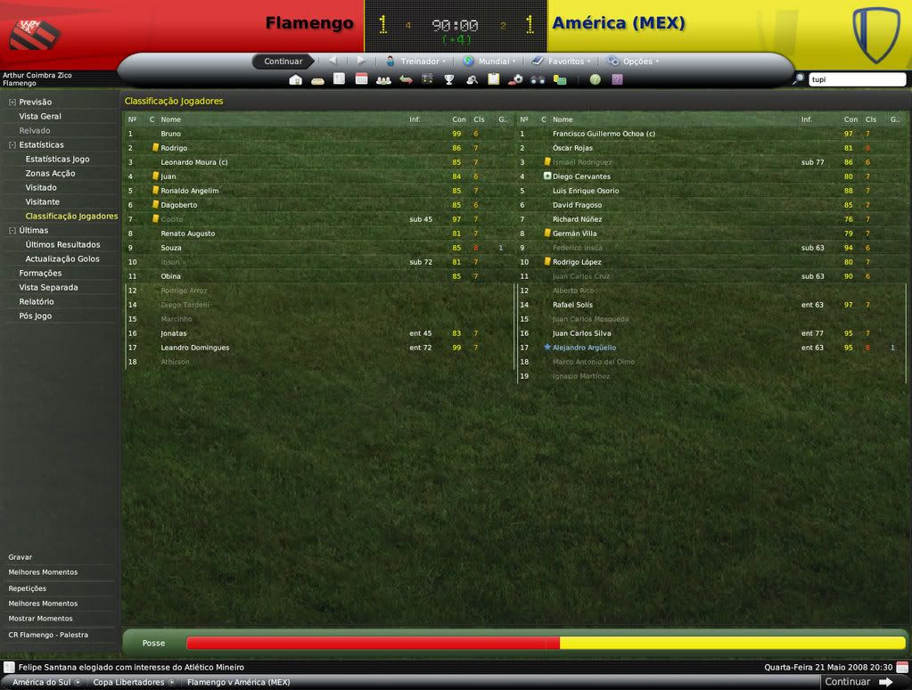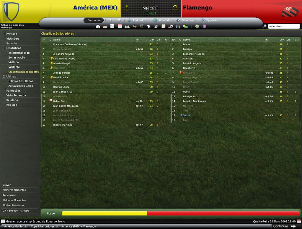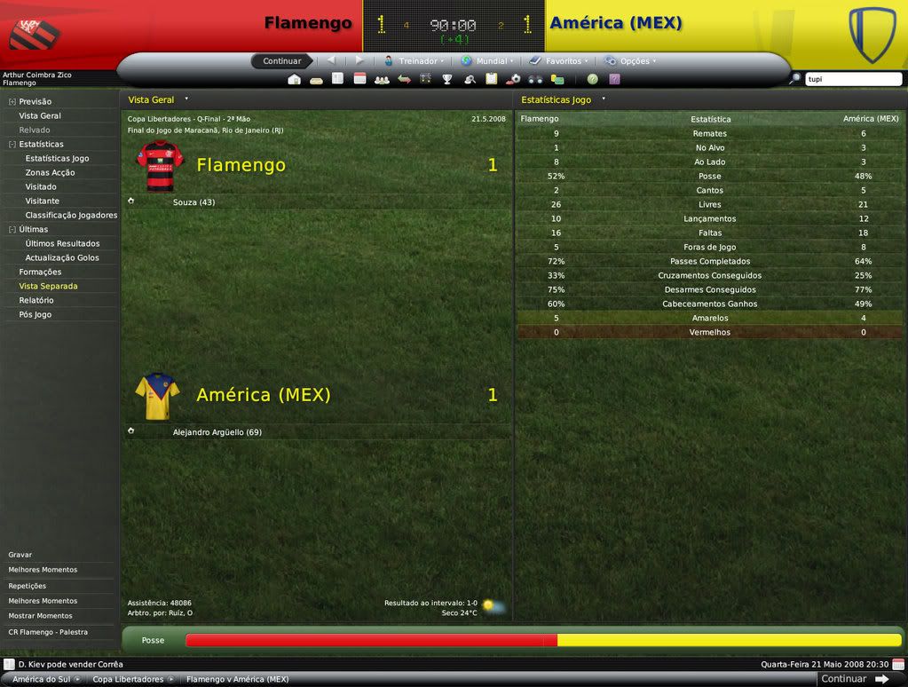 Jirimias Postado 11 de Julho 2008 Denunciar Postado 11 de Julho 2008 Fala grande mestre Jirimias....xD muito bom o save como sempre... grande resultado contra o América lá no méxico, mas vai tomar de 3x0 aki de novo :bleh: boa sorte ai :D E aí, Gui!Sumidaço,hein?!Espero que volte com uma história. SObre o save, não quero repetir a realidade hehe.vlws 21 de maio de 2008 | 01:13 hs Semi-final brasileira Quartas de Final - 2º Jogo 1 X 1 Flamengo | Estatísticas |Escalações | América Oscar Ruiz, este foi o grande nome do jogo.O colombiano desgraçado mostrou que pode ser um grande empecilho para o sucesso não só do Flamengo mas também do São Paulo, sua antipatia com o futebol brasileiro fica cada vez mais evidenciada. Além da distribuição de cartões amarelos a torto e a direito, Ruis anulou o gol legal de Souza, por sorte não precisávamos dele, mas vale lembrar que Ruiz deverá apitar jogos na semi-final e na final. Falando do jogo, se é que é possível falar de um jogo tão chato, o Flamengo foi apenas burocrático enquanto o América estava longe de ser capaz de mudar as coisas.Souza marcou no primeiro tempo de cabeça para o Flamengo, enquanto Arguello empatou a partida depois de receber livre no contra-ataque. Com o empate e a vitória no México, o Mengo terá pela frente o São Paulo, uma semi-final bem brasileira. Outros jogos [ Comentar ] [ (1) Comentário ] [ Imprimir ] Comentaram: Wilsinho – Oscarr Ruim. Ruiz tentou de tudo mas o América é infinitamente ruim,agora que venha o São Paulo!