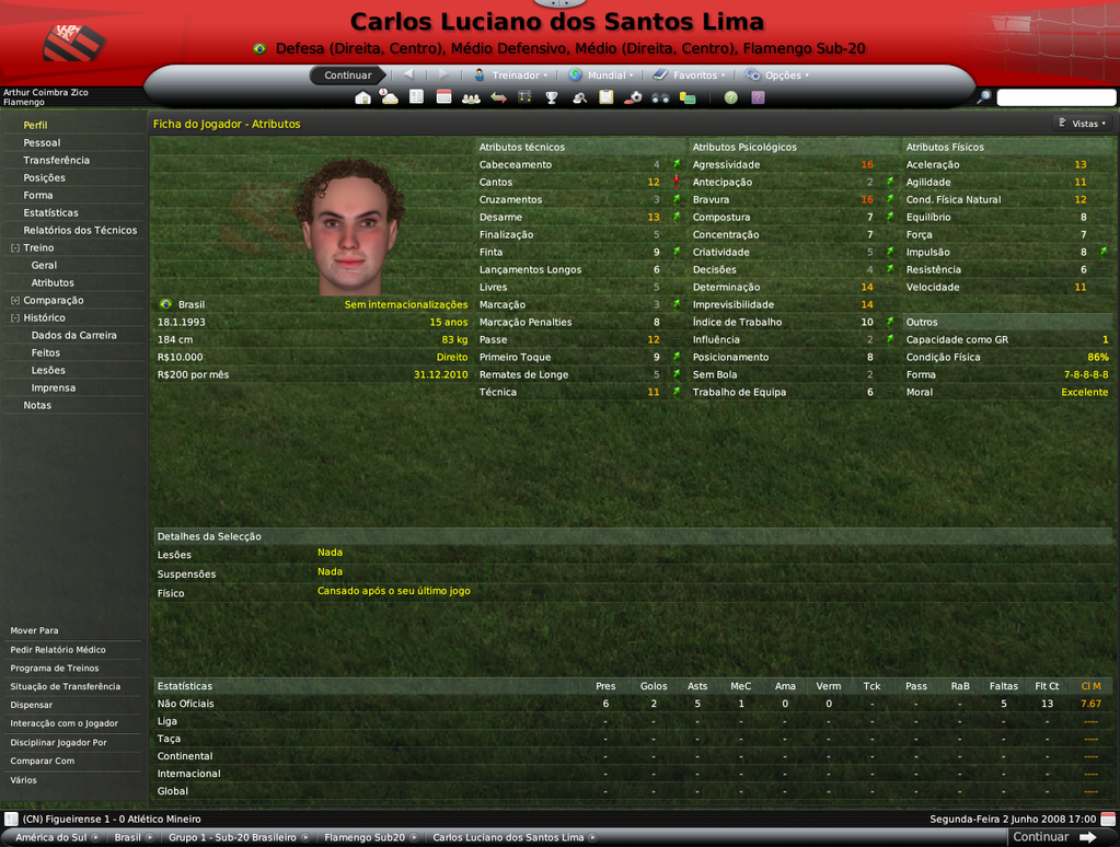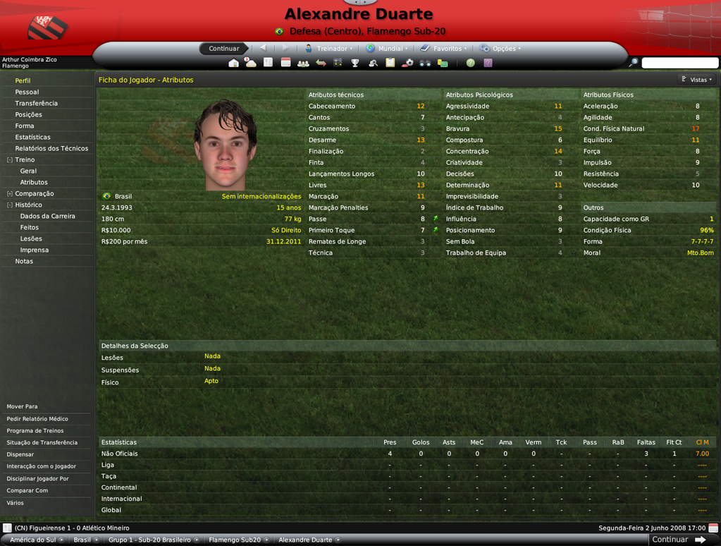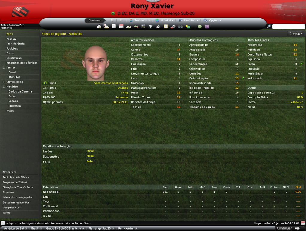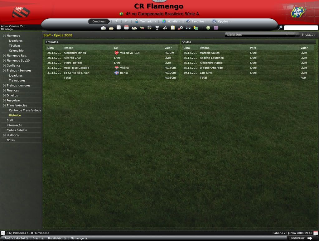 Jirimias Postado 14 de Julho 2008 Denunciar Postado 14 de Julho 2008 Bom, este não será propriamente um resumo, mas um post de informações adicionais, como staffs e sub-20.Vou esperar pelo fim da Libertadores para lançar as estatísticas da equipe e jogos do Campeonato Brasileiro. Destaquei abaixo os principais nomes do elenco sub-20 do Flamengo, entre eles estão jogadores revelados no clube (em preto) e jogadores revelados por outros clubes(em azul).Mas o sol não brilhou para todos, mais de 10 jovens tiveram seus contratos rescindidos ou foram simplesmente dispensados após análise cuidadosa de Adilío. A busca por craques vai continuar pela América do Sul e pelo Brasil. Alexandre Duarte(central promissor) | Anderson Bamba | André | Carlos Luciano (central promissor) | Danilo Moura (ponta promissor) | Erick Flores | Everton (médio promissor) | Fabrício (goleiro promissor, revelado pelo Santos) | Gustavo Siqueira ( médio promissor revelado pelo Santos) | Kayke | Leonardo | Luiz Carlos (central promissor) | Rony Xavier (lateral promissor) | Silva (goleiro promissor) | Vander | Vitor Saba (médio espetacular revelado pelo Vasco)| Omar Andrade | Cristian Borja Não foram tantas mudanças na comissão técnica devido às restrições a números de staffs impostas pelo Flamengo, o que me forçou a oferecer contratos para os treinadores das camadas jovens, os treinos da equipe ficaram desta forma.