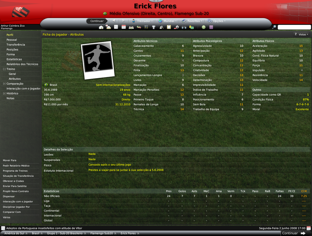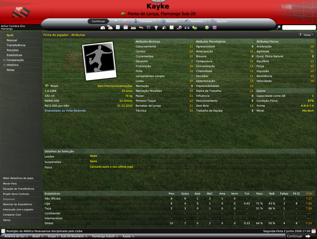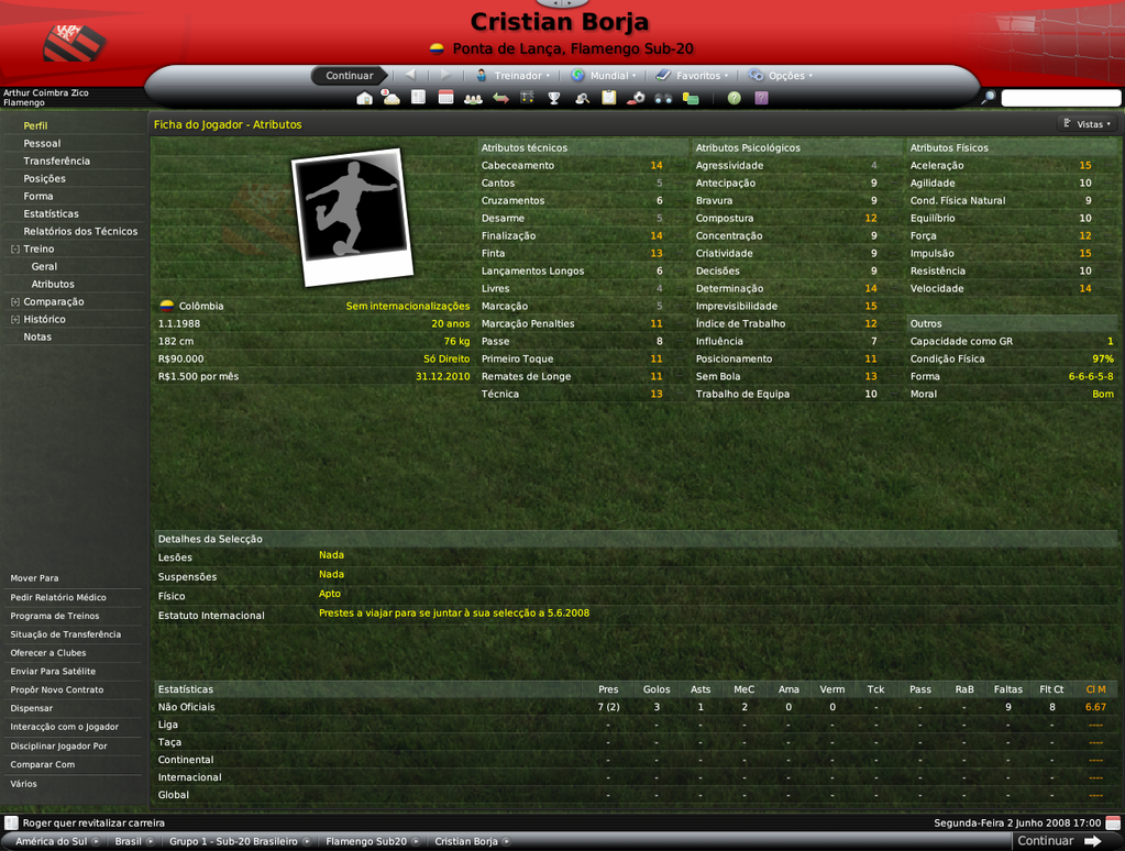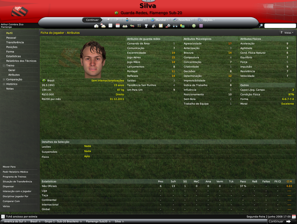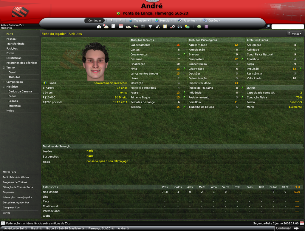 Jirimias Postado 14 de Julho 2008 Denunciar Postado 14 de Julho 2008 Bom, este não será propriamente um resumo, mas um post de informações adicionais, como staffs e sub-20.Vou esperar pelo fim da Libertadores para lançar as estatísticas da equipe e jogos do Campeonato Brasileiro. Destaquei abaixo os principais nomes do elenco sub-20 do Flamengo, entre eles estão jogadores revelados no clube (em preto) e jogadores revelados por outros clubes(em azul).Mas o sol não brilhou para todos, mais de 10 jovens tiveram seus contratos rescindidos ou foram simplesmente dispensados após análise cuidadosa de Adilío. A busca por craques vai continuar pela América do Sul e pelo Brasil. Alexandre Duarte(central promissor) | Anderson Bamba | André | Carlos Luciano (central promissor) | Danilo Moura (ponta promissor) | Erick Flores | Everton (médio promissor) | Fabrício (goleiro promissor, revelado pelo Santos) | Gustavo Siqueira ( médio promissor revelado pelo Santos) | Kayke | Leonardo | Luiz Carlos (central promissor) | Rony Xavier (lateral promissor) | Silva (goleiro promissor) | Vander | Vitor Saba (médio espetacular revelado pelo Vasco)| Omar Andrade | Cristian Borja Não foram tantas mudanças na comissão técnica devido às restrições a números de staffs impostas pelo Flamengo, o que me forçou a oferecer contratos para os treinadores das camadas jovens, os treinos da equipe ficaram desta forma.