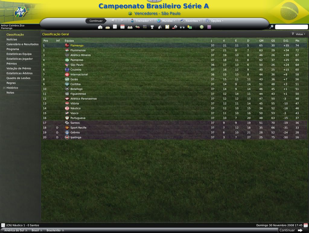 Jirimias Postado 19 de Julho 2008 Denunciar Postado 19 de Julho 2008 07 de Dezembro de 2008 | 23:27 hs Flamengo, hexacampeão Emoção até o final!Flamengo e Fluminense entraram para a última rodada do Brasileirão separados por apenas dois pontos.O Flamengo jogava em casa contra o já rebaixado Sport, enquanto Fluminense precisava vencer o Atlético (PR) na Arena da Baixada para ter o porquê torcer contra o rival. Quer ver uma irnonia do destino?O Hexa viria em uma vitória sobre o Sport. Sport, time considerado campeão pela "imaculada" CBF, mas ainda assim não podemos cair no erro de compararmos os dois momentos, já que 1987 o Flamengo era um timaço, foi o melhor entre os melhores do Brasil, e o Sport estava na 2º divisão acompanhado por uma boa madrinha. A partida A diferença entre as duas equipes era incontestável, só não era maior que o abismo entre as duas equipes em 1987 hehe.Antes da partida, Nelsinho Batista ainda teve o disparate de dizer que ia atrapalhar os planos do Flamengo, mas talvez eu faria o mesmo na condição de desesperado em que ele se encontrava. Quando a bola rolou, a torcida já gritava o Hexa, coisa bonita de se ver! Aos 3 minutos, Renato, o melhor em campo; abriu o placar, beijou o escudo, mostrou seis dedos nas mãos e comemorou, Flamengo 1x0.E o Flamengo era melhor, muito melhor, tinha momentos que era possível esquecer que aquilo era uma partida e não um treino, pena que a falta de pontaria também entrou em campo.Souza preciosu de 42 minutos e 5 gols perdidos para aumentar o placar, Flamengo 2x0, e eu já nem tinha voz para gritar, então comecei a pular.Só parei quando o Fluminense fez 1x0 no Atlético(PR), sou precavido quanto a esse negócio de oba-oba. Porém, se o Flamengo tinha uma pontaria ruim, nesse quesito o Sport estava bem, principalmente quando o alvo eram os jogadores do Flamengo.Elias foi expulso aos 25 minutos e Igor aos 30 do 2º tempo, e de quebra ainda tirou Renato Augusto do Mundial de Tóquio...mal perdedor! O Flamengo venceu por 2x0 e sagrou-se HEXACAMPEÃO.[/b] Outros jogos da rodada Antes do início da 38º rodada, somente Santos e Portuguesa ainda lutavam contra rebaixamento.Ambos jogavam fora de casa contra Cruzeiro e Coritibam, respectivamente.O Santos precisava vencer e torcer para a Portuguesa empatar pelo menos, a Portuguesa fez a parte dela nos planos do Santos:perdeu, mas o Santos esqueceu que dependia antes de tudo de si mesmo e vacilou perante o Cruzeiro. Desta forma a Série B terá ótimos jogos encabeçados por Grêmio, do agora treinador Abel Braga,Santos,Sport e Ipatinga.Contudo, quem esperava um Santos e Corinthians pela Série B pode tirar o cavalinho da chuva, o Corinthians subiu,mano! Confira aqui a Série C. Classificação 08 de Dezembro de 2008 | 13:15hs Por quê é desonesto dizer que o Flamengo não é hexa??? Admito que sou contra qualquer discussão sobre o incontestável (pelo menos para seres humanos de bom senso e não para doidos varridos ou gente desonesta) título rubro-negro de 1987, conquistado em vitórias épicas sobre esquadrões como o Atlético Mineiro e o Internacional de Porto Alegre. Diga-se de passagem, diante de platéias gigantescas nos locais de jogos (sabe-se que a torcida do Atlético Mineiro é a maior de Minas mesmo e lotou sua metade do Mineirão naquela semifinal) e da atenção de todo o Brasil. Os torcedores mais novos conseguem acreditar realmente que a CBF é uma instituição tão proba e honesta quanto um convento de irmãs carmelitas descalças, por isso repetiam a ladainha de que o Mengão era tetra e agora penta como se fosse isto um mantra que lhes trouxesse paz, glória e tranqüilidade. Eu decidi que, de agora em diante, tratarei como pessoa desonesta e sem escrúpulos todo aquele que não reconhece o Penta Rubro-Negro como legítimo. Quem tiver este comportamento, para mim, é igual a quem apóie a pizza do Renan, o Mensalão do Lula, os anões do Orçamento e o esquema PC Farias. Para entender melhor o motivo de tanta veemência, um pouco de história: em 1987, a Confederação Brasileira de Futebol (CBF), recém-criada da antiga Confederação Brasileira de Desportos (CBD), vivia grave crise financeira e um monumental descrédito. O campeonato do ano anterior tinha repetido os tempos da Arena (“Onde a Arena vai mal, um time no Nacional/Onde a Arena vai bem, outro time também”). Exatos 44 clubes haviam disputado o campeonato, que terminou com a justa vitória são-paulina. Mas o prejuízo amargado pela CBF ameaçava até mesmo a realização do certame de 1987. Por causa disto, os treze maiores clubes do Brasil, liderados pelo sr. Carlos Miguel Aidar – então presidente do São Paulo – fecharam um patrocínio com a TV Globo e convidaram mais três clubes para formar um campeonato com 16 clubes. A CBF concordou com tudo. O campeonato começou já com grandes rendas, muito emocionante, com todos jogando contra todos e não divididos em grupos, sorteados de forma que um time grande jogava contra o Arapiraca e outro jogava contra um time grande. Diante do sucesso iminente do campeonato, se irritaram os srs. Otávio Pinto Guimarães e Nabi Abi Chedid (nota: pessoas que inspiram VOCÊ, que ataca o título rubro-negro), que se mantinham anos no poder na CBF graças à estratégia (até hoje usada em algumas federações) de se apoiar em clubes pequenos. Tudo que Otávio e Nabi NÃO queriam era a autonomia dos grandes clubes que, com sua popularidade, não precisavam da CBF para organizar campeonato – como acontece na Europa, onde, por exemplo, a Premier League inglesa não é a mesma entidade que gere a seleção nacional. Diante da oposição da dupla, os clubes grandes criaram o Clube dos Treze e impuseram a criação de um campeonato com menos clubes. Se realizaram dois campeonatos paralelos, o Módulo Verde, do Clube dos Treze, com 16 clubes, e o Módulo Amarelo, organizado pela CBF com 15 clubes que haviam sido excluído do Clube dos 13. O mó