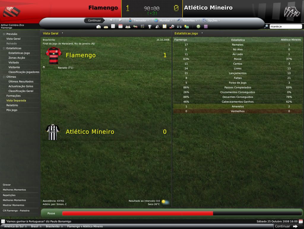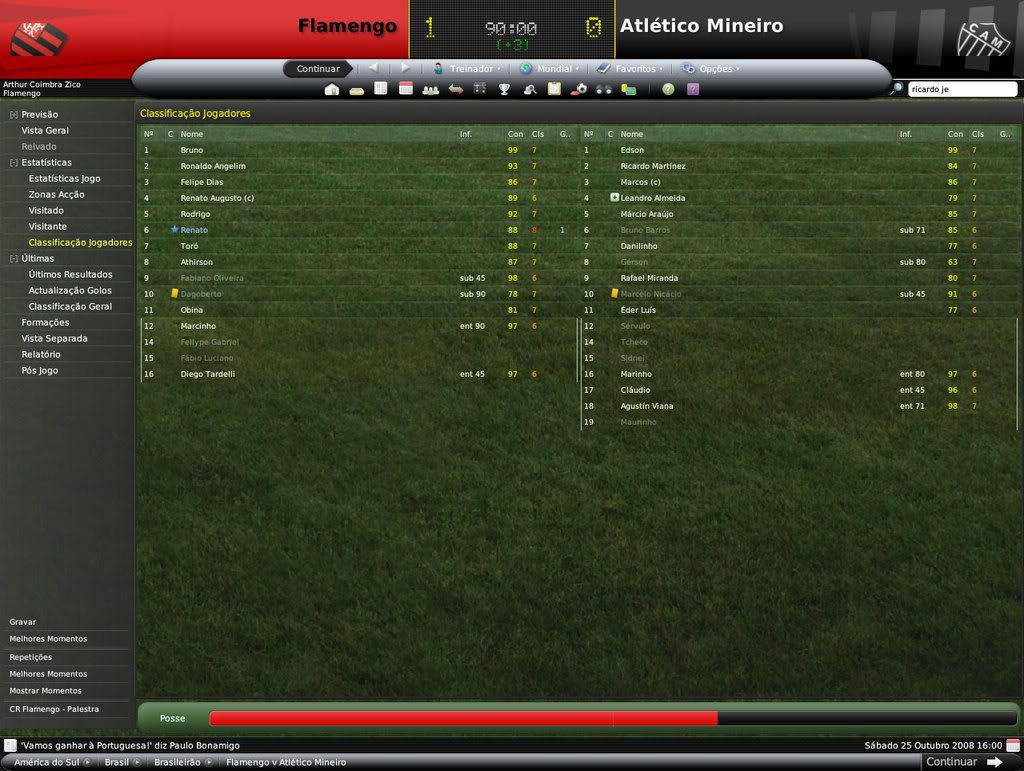 Jirimias Postado 19 de Julho 2008 Denunciar Postado 19 de Julho 2008 25 de outubro de 2008 | 23:27 hs Depois de entregar os pontos, Flamengo retoma a liderança. Que fase mardita!Mas enfim ela terminou na partida de ontem com o Atlético(MG).O Flamengo vinha de cinco partidas sem vitórias, enquanto o adversário seguia em situação oposta, com cinco jogos sem conhecer uma derrota. O jogo era fácil, mas quando a coisa tá feia até o jogo mais fácil vira um grande drama.O domínio do Flamengo era notável, mas a falta de pontaria destacava-se mais.No geral equipe mostrava uma sensível melhora, concidentemen, para esta partidate Zico pôde contar com a volta de Renato Augusto, servindo a seleção sub-20, Dagoberto,Obina lesionados e Rodrigo suspenso. A apreensão para resolver a partida era facilmente notada em cada chance perdida.Somente no minuto 26 do segundo tempo o gol rubro-negro saiu, Renato entrou na área e bateu quase sem ângulo.O Atlético não reagiu ao gol e o Flamengo se conformou com a diferença mínima do placar, que era o bastante para devolver a liderança à equipe. Outros jogos da rodada Outros jogos Classificação Santos e Grêmio brigam para não cair; e para vencer o rebaixamento vale tudo, até trocar de treinador mais uma vez como fez o Grêmio. [ Comentar ] [ (1) Comentários ] [ Imprimir ] Comentaram: Macedo –Que aperto ! Mengão se recuperou da fase da urucubaca, Renato tem sido fundamental.