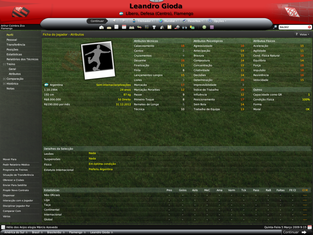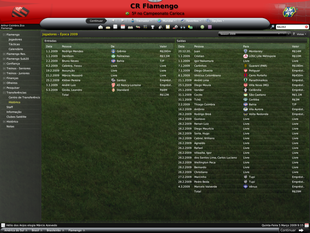 Jirimias Postado 23 de Julho 2008 Denunciar Postado 23 de Julho 2008 Pelo menos eu fracasso e admito, não preciso ficar voltando os jogos para provar para um bando de criancinhas que sou o bom no FM. O objetivo é vencer, mas de que adianta vencer se você sabe que no caminho para vitória você agiu errado? La pergunta??? tem o Adrianinho tbm pra MAE, e tem passagem pelo Flamengo ele, no FM é um excelente jogador Vixi, não tenho boas lembranças do Adrianinho, e tb a nossa meia esquerda já tem Denilson,Renato e o R.Augusto que pode jogar ali.Mas a zaga ganhou reforços, e dos bons! O Cabrera me parece ter bons atributos para a baixa idade dele... E gostei também das contratações do Rodrigo e do Assunção. Vendeu muito bem o pamonha do Cristian. Parabéns pela TG e quero ver ganhar a Taça Rio, a Libertadores, o Brasileiro e quissá o Mundial. shhuashuahus Boa sorte! Cabrera foi uma indicação muito feliz, já era apra ter contrato mas resolvi esperar o contrato dele acabar, tá começando a despontar entre os juniores. Daui duas temporadas tenho um time gringo shuahsuahsua.Cristian, o pamonha, ganhou oferta logo depois que coloquei em transferência, parece que ele tá como moral no FM> Primeiro passo foi dado, o Carioca é mesmo apra preparar a equipe para os outros campeonatos, o título é bom para dar aquela ultrapassada no Flu. vlws otimooo vamo bi cariocaaa go go go +) vamo que vamo!! já tah quase ficando sem graça! ehaiuehaiuehaiehaiueauiea muito bem, vamos ver o q poderá fazer na libertadores, q na minha opinião é o que realmente importa! boa sorte jiri! Começa a ficar semg raça sim, a sorte do save é a regra de contratação, senão eu já tinha mandado um Dátolo, um Buonanotte ali na meiúca e ia ganhar do mundo inteiro shuahsuhaushauhsua. Tb espero um bom desempenho da LIbertadores, se bem que tive alguns problemas para inscrever jogadores. Impecável seu time. Até agora está bem mesmo,River. vlws!