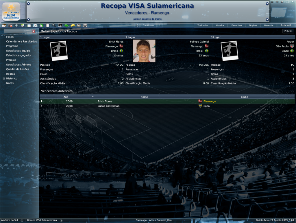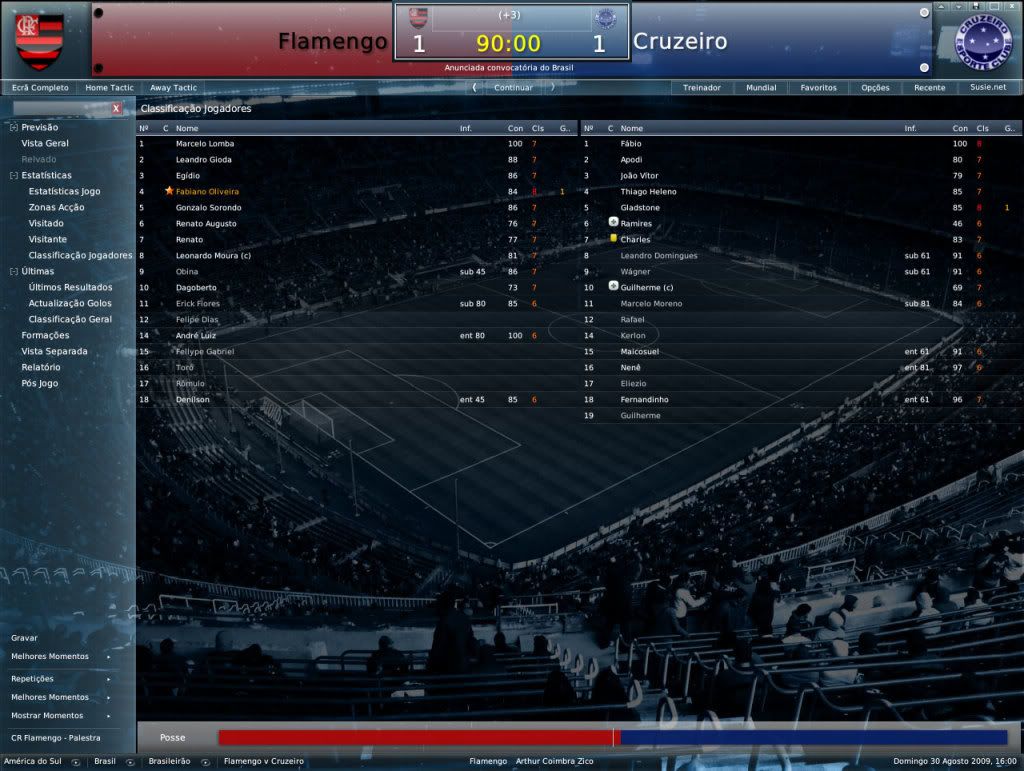 Jirimias Postado 30 de Julho 2008 Denunciar Postado 30 de Julho 2008 CHUPA BAMBI! \o/ isso mostra a força dos jogos dentro de casa, e das instruções ao intervalo. parabéns pelo titulo ;] Valeu!! è engraçado pedir para um time que está jogando muito bem e ganhando um jogo para ter mais paixão, achei que iam cair matando no dia seguinte, mas como fomos campeões, eles até elogiaram meu comportamento enérgico. O Maracanã com do nosso lado com certeza é uma força extra, mas qdo o time não faz força a coisa fica feia. esse empate nao foi muito bom mas... ainda acredito que voce passe nossa a sul america 1 vez que vejo uma final com tantos gols oO Tá muito difícil no Brasileiro, não cosnigo repetir o mesmo time mais, e o time tem cedido empates e derrotas de bobeira, acho que o time estagnou. Na Recopa era apra ser duas goleadas para nós, o time do Flamengo foi muito,muito melhor que o São Paulo nas duas aprtidas, mas futebol é isto, a mira deles no primeiro jogo estava arrojada, assim como a nossa na segunda partida.Acho que os gols em demasia vem da falta de responsabilidade das equipes com o título, agora vem a Sul-Americana.