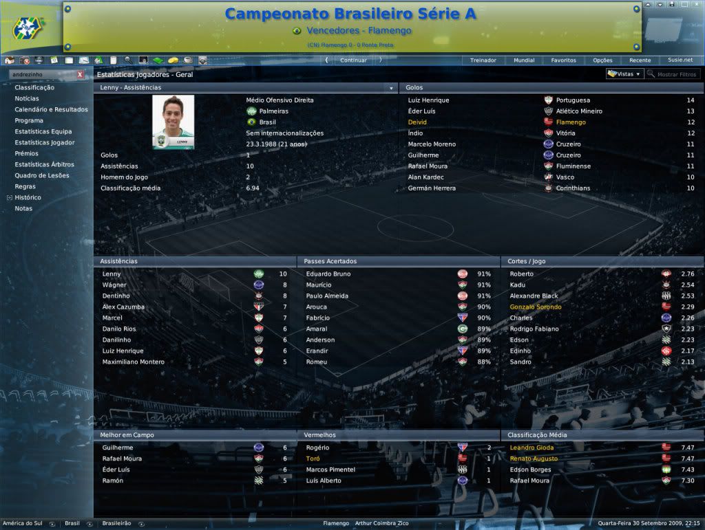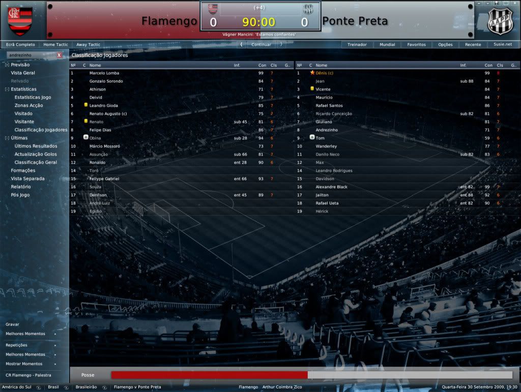 Jirimias Postado 31 de Julho 2008 Denunciar Postado 31 de Julho 2008 Relatório/Resumo Neste relatório foram adicionados jogadores que eram do clube mas estavam emprestados, portanto não entram na Regra de 3. Notas do elenco . Regra de 3 Os seguintes jogadores estão incluídos na regra que permite no plantel a presença de três jogadores que não tem passagem pelo Flamengo ou não tem o clube como favorito. Leandro Gioda – Favorito:Lánus Sorondo – Favorito: Elenco do início do save Abaixo estão os jogadores que faziam parte do clube assim que assumi ou tem o clube como favorito, ou seja, não estão sujeitos à regra de 3. Favorito:Flamengo Marcelo Lomba Felipe Dias Leonardo Moura Athirson Rômulo Renato Augusto Dagoberto Souza Obina Paulo Sérgio Egídio Renato Fabiano Oliveira Fellype Gabriel Thiago Sales(base) Ronaldo Deivid Wilson Fabão Márcio Mossoró Denilson Assunção André Luiz Erick Flôres Favorito:Nenhum Éder Marabá Yuri Favorito:Outros Ronaldo Angelim (Icasa) Juan (São Paulo) Toró (Fluminense) Camadas jovens Revelados no clube(Regra de 5+) O plantel principal deve contar com um mínimo de 5 jogadores revelados no clube por temporada Renato Augusto Ibson Rômulo Athirson Egídio Fabiano Oliveira Fellype Gabriel Wilson Erick Flôres Fabão Jogadores que subiram para a equipe principal Toda temporada um jogador das divisões de abse deve subir para a equipe principal, sem a obrigação de atuar. Erick Flôres Jogadores que aderiram o Flamengo como favorito Cada jogador incluso na Regra de 3 que adotar o Flamengo como favorito, abre automaticamente uma vaga para uma outra contratação exceção. Nenhum André Luiz