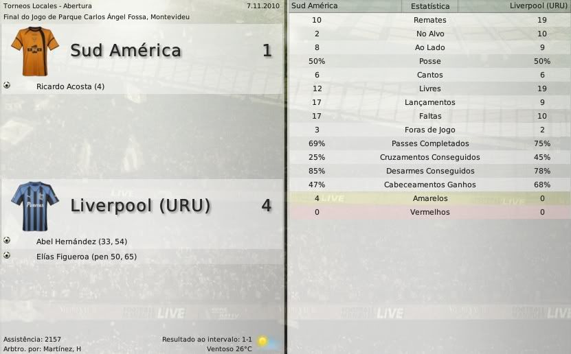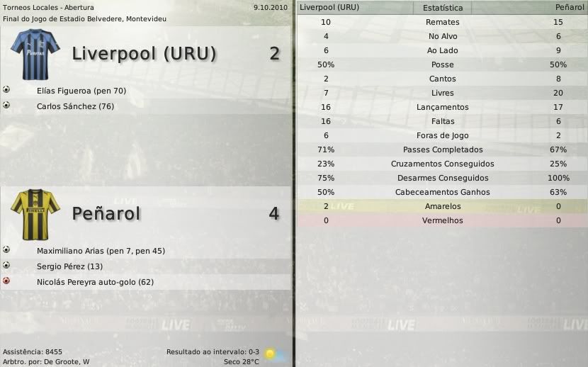 gq-tricolor Postado 25 de Setembro 2008 Autor Denunciar Postado 25 de Setembro 2008 Español | English | Português 7 de novembro de 2010 O campeão do primeiro turno parece já estar definido. Claro que os cinco pontos deixam o Peñarol bem à vontade no topo da tabela, porém tudo pode acontecer nessa reta final. O River Plate segue na segunda colocação com bastante estabilidade, já são 8 rodadas ali. O Liverpool oscilou um pouco, mas segue bem classificado. Abaixo dos três vemos o Defensor, o Nacional e o Bella Vista. O Danubio está já meio afastado da briga por um lugar ao sol. Lá embaixo o negócio ainda está embolado. A decepção maior até o presente momento é o Montevideu Wanderers que está a apenas 3 pontos do último colocado. Central Español 1 x 2 Liverpool - Güelmo / Pereyra e Abel Hernández Parque Palermo, Montevideu Liverpool 2 x 4 Peñarol - Figueroa e Sánchez / Arias(2) Pérez e Pereyra(contra) Belvedere, Montevideu Wanderers 2 x 1 Liverpool - Britos e Fagúndez / Figueroa Alfredo Víctor Viera, Montevideu Liverpool 1 x 0 Fénix - Abel Hernández Belvedere, Montevideu Sud América 1 x 4 Liverpool - Ricardo Acosta / Figueroa(2) e Abél Hernández(2) Carlos Ángel Fossa, Montevideu Nicolás Pereyra - Entre 1 mês e 2 meses Citar