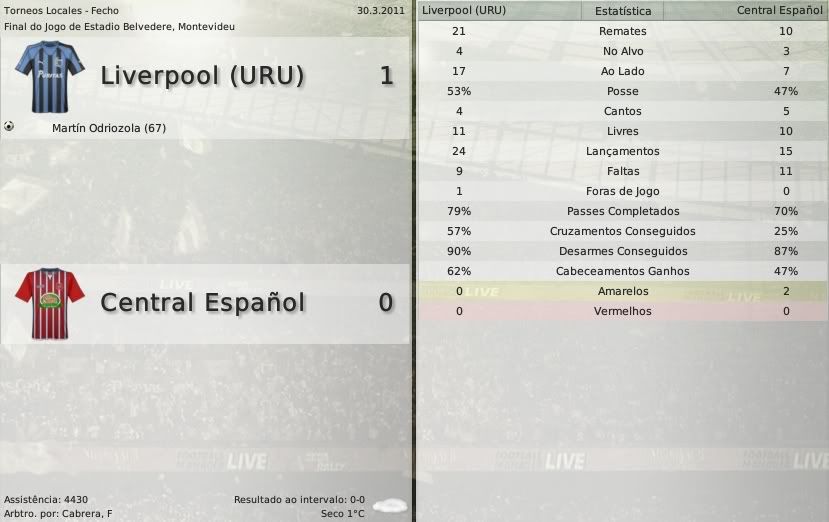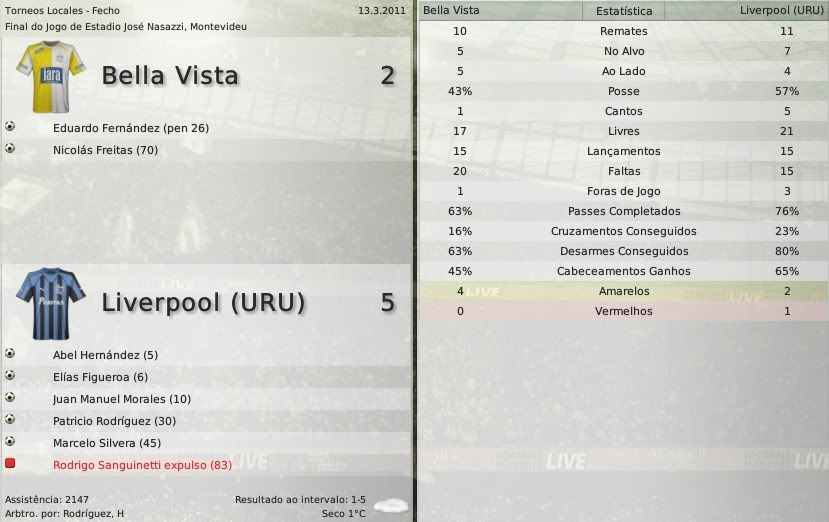 gq-tricolor Postado 1 de Outubro 2008 Autor Denunciar Postado 1 de Outubro 2008 Español | English | Português 17 de abril de 2011 Dois pontos separam o líder do returno, Peñarol do segundo colocado, Liverpool. O clube negriazul fará seus quatro últimos jogos (dois em casa e dois fora) contra o Defensor, quarto, o River Plate, sexto, o Miramar, décimo e o Nacional, terceiro. O Peñarol por sua vez enfrentará o Nacional fora de casa, o Deportivo Maldonado em casa, o Cerro fora e o Juventud em casa. Se compararmos os próximos jogos dos dois time veremos que o Peñarol leva vantagem, porque enfrenta adverários mais fracos. Porém sabemos que o futebol surpreende. Classificação do Clausura: Peñarol, Nacional, Liverpool e Defensor Sportig já garantiram sua presença na Liguilla deste ano. Na briga pela sobrevivência destacamos o Fénix, que recém promovido provavelmente não cairá. E quem corre sérios riscos de rebaixamento é o Central Español, dono de um título Uruguaio. Veja a tabela de classificação geral: Praticamente sem chances. Essa é a situação incomoda que vive o Liverpool depois de perder seu terceiro jogo na Copa Libertadores, o segundo fora. Os negriazules estão à beira de abandonar a maior competição sul-americana. O jogo contra o El Nacional, marcando o início dos jogos de volta do seu grupo, terminou da mesma forma como o primeiro entre os dois times. O El Nacional saiu na frente abrindo dois gols de vantagem sobre o Liverpool, que só foi reagir no último minuto de jogo com um golaço de Céspedes. Essa partida não foi diferente de todas as outras que o Liverpool fez na Libertadores. Jogou de igual para igual com o adversário mas não conseguiu fazer os gols. "Pra frente, carajos!" - bradava Alvarado ao lado do campo durante vários momenos do jogo. Além de gritar, xingar e gesticular muito, o técnico do Liverpool deu um show à parte demonstrando que ainda tem muita disposição física pulando de raiva e chutando furiosamente sua bola imaginária. Assista ao jogo Veja as chances do Liverpool seguir vivo na competição, restando dois jogos: Empatando e vencendo: Além de torcer para o El Nacional perder os dois jogos, o Liverpool terá que ultrapassá-lo no saldo de gols; Vencendo e vencendo: Assim, o El Nacional pode fazer até dois pontos. Liverpool 1 x 1 Wanderers - Scagliola / Nicolás Ruiz Belvedere, Montevideu Liverpool 1 x 0 Central Español - Odriozola Belvedere, Montevideu Fénix 3 x 2 Liverpool - Ifrán e González(2) / Céspedes e Abel Hernández Parque Capurro, Montevideu Copa Libertadores El Nacional 2 x 1 Liverpool - Valencia e Caicedo / Céspedes Olímpico Atahualpa Liverpool 3 x 0 Sud América - Figueroa, Abel Hernández e Sanguinetti Belvedere, Montevideu Liverpool 2 x 0 Tacuarembó - Correa e Abel Hernández Belvedere, Montevideu Citar