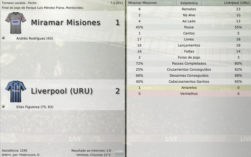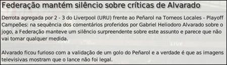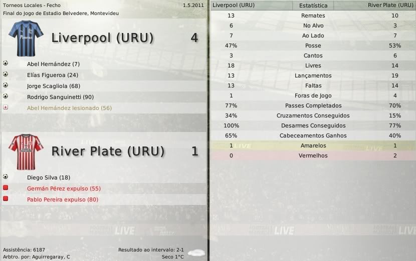 gq-tricolor Postado 4 de Outubro 2008 Autor Denunciar Postado 4 de Outubro 2008 Español | English | Português 25 de maio de 2011 Peñarol é tetra Alvarado inconformado com arbitragem O último gol da final do campeonato foi irregular. Esterilla recebeu a bola em impedimento no lance que resultou no gol. O lance era difícil, tanto foi que o banco do Liverpool, além do próprio Alvarado, não reclamou no momento do gol. Mas a confirmação após a partida fez com que o treinador dos negriazules desabafasse: "Sempre erram no momento crucial contra nós, que palhaçada, estamos de saco cheio com tudo isso. Porra, sempre com nós. Jogamos pra vencer e o título nos foi tirado dessa maneira. Isso chega a ser cruel". Mas que final foi essa. O Liverpool pela primeira vez na sua história disputando o título do Campeonato Uruguaio e justamente contra o maior campeão do mesmo. Ali estavam, lado a lado, 39 títulos aurinegros contra nenhum negriazul. E o "massacre" que se esperava, especialmente pela força do Peñarol em decisões, não aconteceu. No primeiro jogo, o Liverpool arrancou um empate em casa depois de sair atrás no marcador. O argentino Patricio Rodríguez foi o responsável pelo gol negriazul. Esterilla fez o do Peñarol. Assista ao jogo O segundo jogo, na casa do Peñarol, foi acompanhado por cerca de 63 mil pessoas que viram o mandante vencer a partida e levar o caneco. Cubilla foi de herói à vilão. Fez o primeiro gol do jogo aos 10' e marcou contra o gol do empate provisório do Liverpool aos 63'. Porém quem o salvou foi Esterilla, com ajudinha da arbitragem, marcando o gol do título aurinegro exatamente aos 72'. No fim do jogo sobrou emoção. E nos acréscimos o Liverpool quase chega ao primeiro título uruguaio de sua história. Scagliola pegou um rebote e chutou ao gol, a bola desvia no zagueiro do Peñarol e bate no travessão. Não deu, Liverpool, o título mais uma vez fica nas mãos de Gustavo Matosas. Assista ao jogo O resultado agregado: Mais noticias. Os premiados da temporada também já são conhecidos: Melhor jogador: Artilheiro: Jovem jogador: Seleção do campeonato: Melhor treinador: Por equipe: Individual: O Liverpool jogará dois jogos em casa e três fora. Os jogos em casa são contra o Nacional e o Cerro. Fora: Danubio, Defensor e Peñarol. Citar