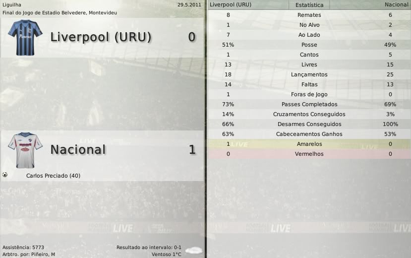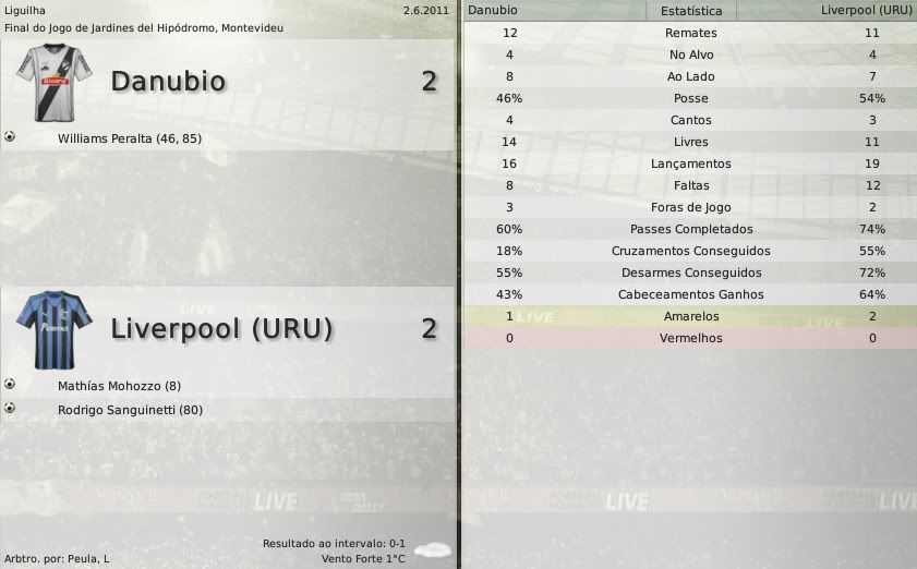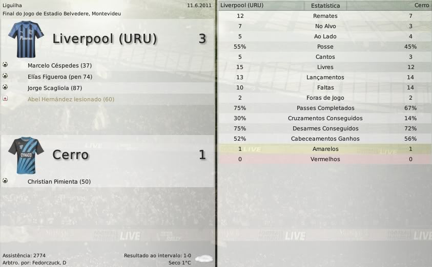 gq-tricolor Postado 5 de Outubro 2008 Autor Denunciar Postado 5 de Outubro 2008 Español | English | Português 19 de junho de 2011 Após um apagão, o Liverpool reagiu depois de estar tomando 4 a 1 do Peñarol. Scagliola fez dois gols que deixaram o seu time a um gol do Peñarol, mas era tarde, Peñarol 4, Liverpool 3. "Vão mudar alguma regra novamente? Avisem-nos, porque já estamos começando a nos preparar para a Sul-Americana. E depois tem Libertadores. Avisem-nos sobre qualquer coisa." - Alvarado irônico. Com o empate no jogo contra o Peñarol, os negriazules terminaram em terceiro já que o Nacional empatou sem gols com o Defensor. Como o Peñarol já tinha passaporte para a Libertadores do ano que vem, Cerro e Liverpool garantiram presença na futura competição. Alguns dados referentes à equipe do Liverpool ao findar esta temporada: A formação do Liverpool foi esse 4-3-1-2 (abaixo) durante toda a temporada. A escalação variou, já tivemos na lateral-esquerda Martín Odriozola, pelo meio-campo passaram Edison Calle, Valentin Ramos, Tabaré Viudez e Nicolás Pereyra. No ataque recentemente Scagliola vinha atuando como titular devido à lesão de Abel Hernández. Citar