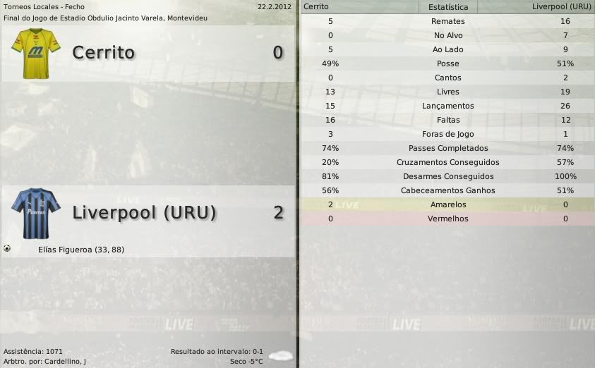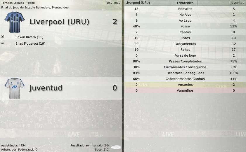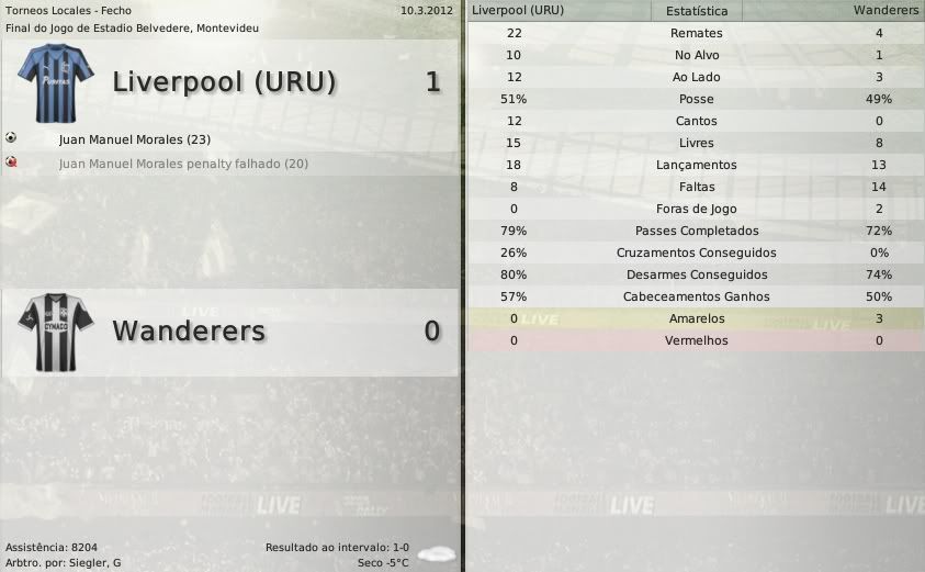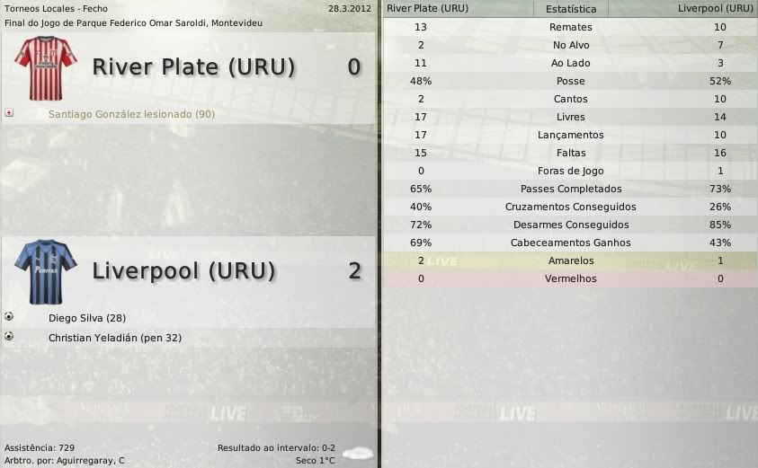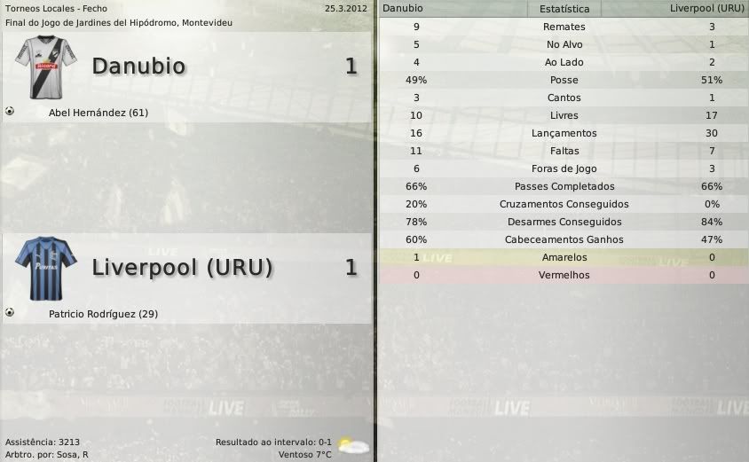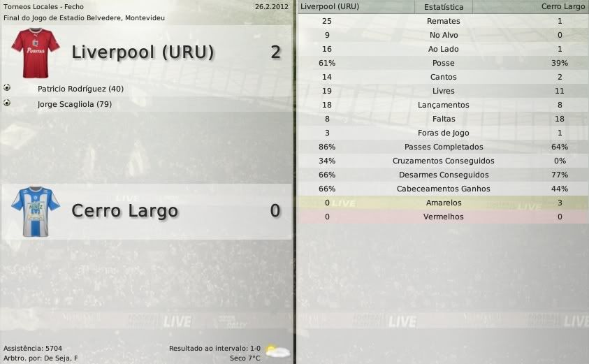 gq-tricolor Postado 14 de Outubro 2008 Autor Denunciar Postado 14 de Outubro 2008 Español | English | Português 28 de março de 2012 Ainda em boa seqüencia o Liverpool assumiu a ponta do Uruguaio ao bater o Peñarol em casa. Depois disso só assegurou a boa posição. Abaixo vai a tabela do Clausura e a geral: No último jogo pela Libertadores, o Liverpool fez o seu papel de casa, tão pregado por Alvarado, e venceu de forma apertada o Universidad Católica. E ainda se beneficiou de mais um empate do Independiente. Dessa vez a vítima do "um ponto" foi o Cúcuta. E os maiores vencedores do torneio seguem apenas na base do empate. Independiente 1 x 1 Liverpool - Enzo Bruno / Figueroa Libertadores da América, Avellaneda Liverpool 3 x 0 Peñarol - Diego Silva, Mohozzo e Paulo Márquez Belvedere, Montevideu Liverpool 2 x 1 Universidad Católica - Mohozzo e Diego Silva / Gálvez Belvedere, Montevideu Danubio 1 x 1 Liverpool - Abel Hernández / P. Rodríguez Jardines del Hipódromo, Montevideu River Plate 0 x 2 Liverpool - Diego Silva e Yeladián Federico Omar Saroldi, Montevideu Pessoal, foi o melhor que pude fazer para não deixar parado o save. Quando puder darei uma geral nos posts que fiz com esse PC. Citar