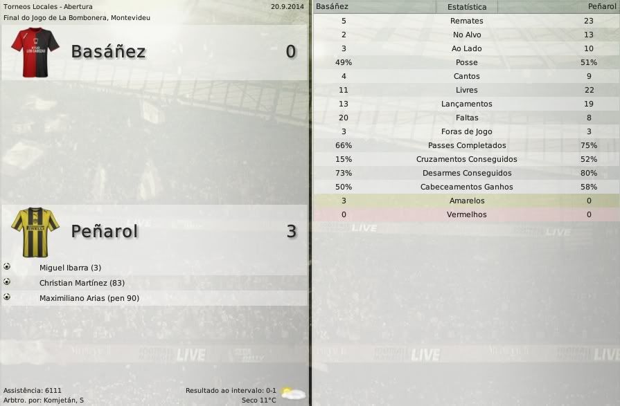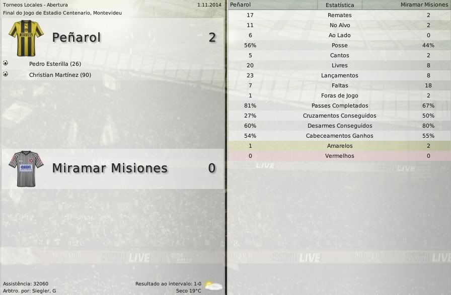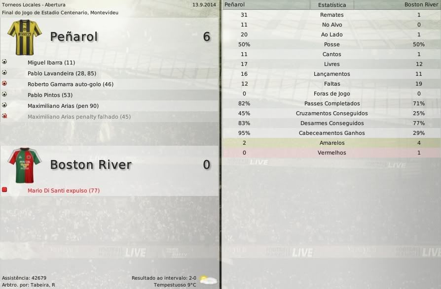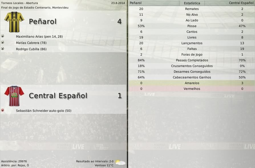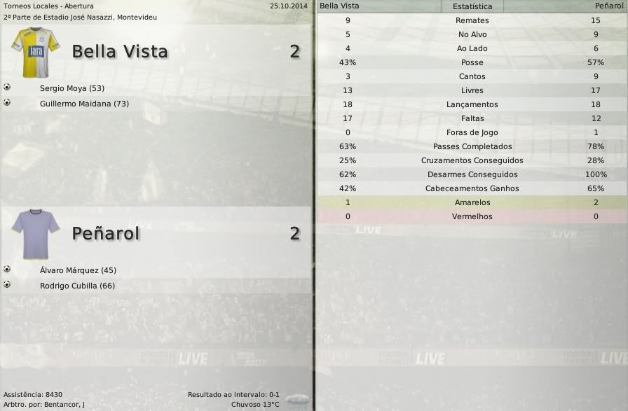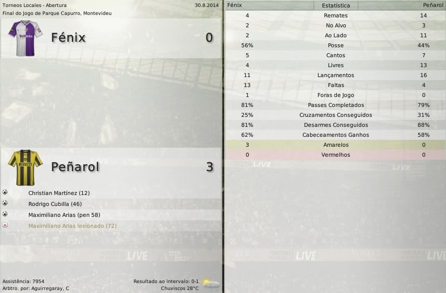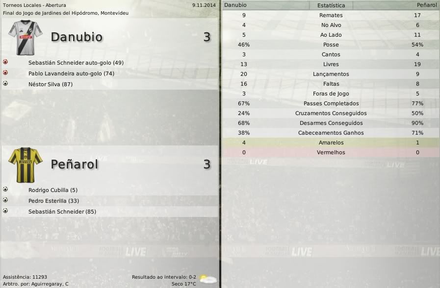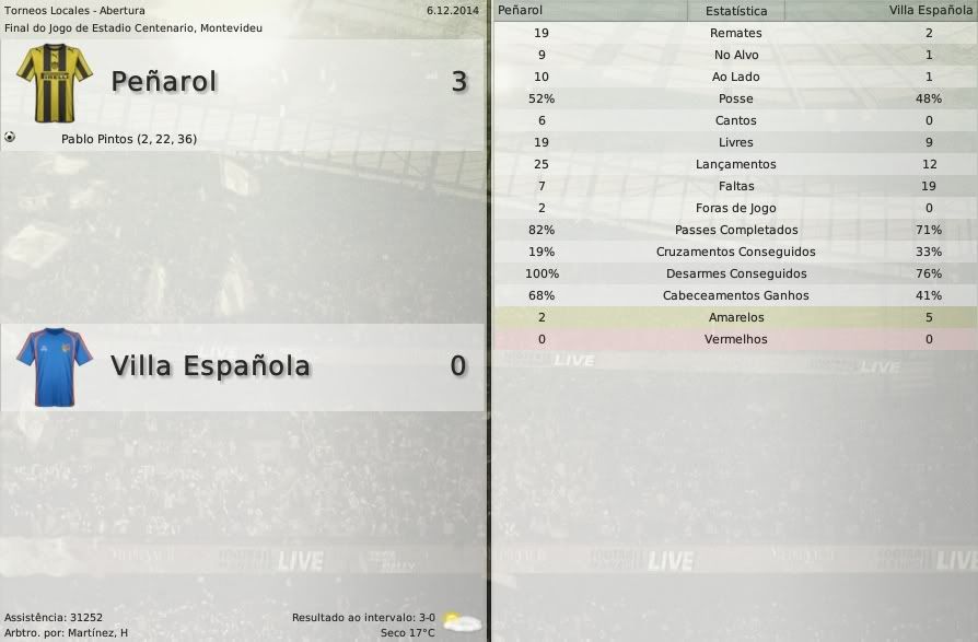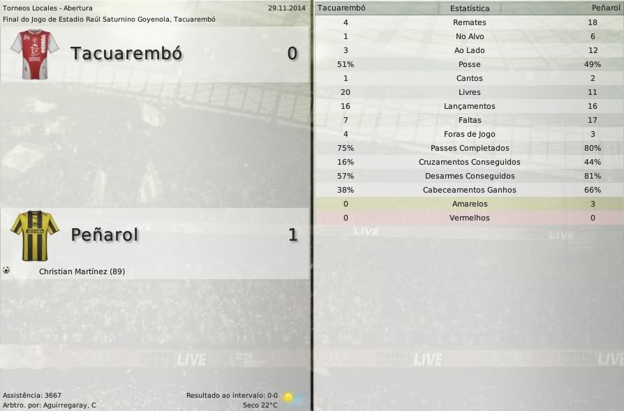 gq-tricolor Postado 18 de Novembro 2008 Autor Denunciar Postado 18 de Novembro 2008 Español | English | Português 23 de novembro de 2014 Peñarol marca passo, empatando com o Liverpool No reencontro com ex-clube, vice campeão da Libertadores, Alvardo sofre, mas dessa vez pelo clube aurinegro Recuperar o título nacional é a missão de Alvarado. Ele foi contratado para isso. Mesmo seu currículo não apresentando título algum, somente alguns vices. "Tudo tem que ser difícil" - disse ele ao fim do empate em casa contra o Liverpool. Alvarado se refere ao número de chances de gols perdidas durante a competição. Segundo Alvarado o Peñarol tem um potencial ofensivo para muito mais que vem apresentando. O artilheiro da equipe na competição é o volante Arias, coim 6 gols. Hoje foi a vez de Cubillas e Pintos deixarem o seu. "Agora sou Peñarol" - disse pela milésima vez o treinador do maior clube uruguaio ao ser questionado sobre qual seria o seu time do coração. O Cerro vem embalado na briga pelo título do Apertura. Soma já oito vitórias consecutivas, enquanto seus concorrentes vem tropeçando. O Peñarol parou depois que perdeu seu primeiro jogo no campeonato. De lá para cá a vitória mais marcante foi contra o Nacional em casa. Atualmento os aurinegros estão na 3ª colocação. Vai afunilar e o Peñarol demonstra pouco folêgo. Peñarol 2 x 0 Nacional - Arias e Esterilla Centenario, Montevideu Bella Vista 2 x 2 Peñarol - Moya e Maidana / Márquez e Cubilla José Nasazzi, Montevideu Peñarol 2 x 0 Miramar Missiones - Esterilla e Martínez Centenario, Montevideu Danubio 3 x 3 Peñarol - Schneider(contra), Lavandeira(contra) e Silva / Cubilla, Esterilla e Schneider Jardines del Hipódromo, Montevideu Peñarol 2 x 2 Liverpool - Cubilla e Pintos / Márquez e Scagliola Centenario, Montevideu Na Rússia o CSKA venceu na última rodada a Premier-Liga. O destino deixou cara a cara os dois concorrentes ao título e o time de Moscou venceu em casa o Zenit, tirando os azuis-branco-azuis claro da liderança depois de 9 rodadas. Citar