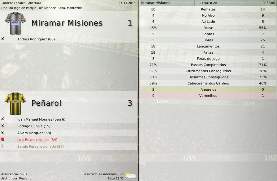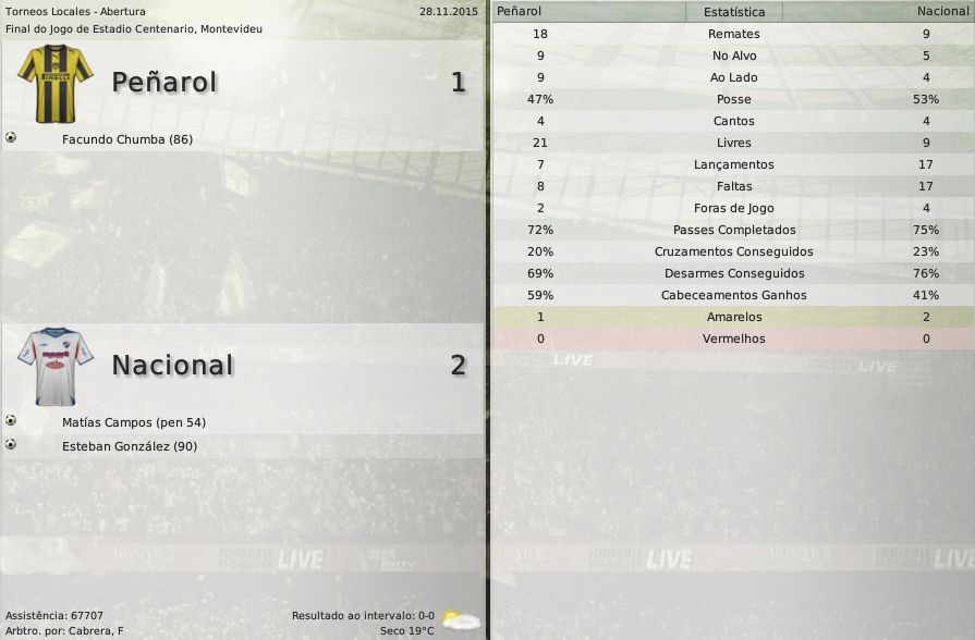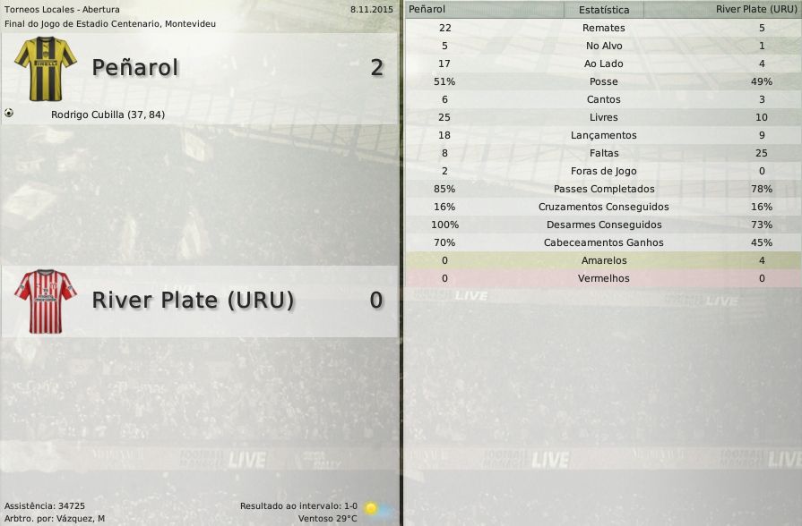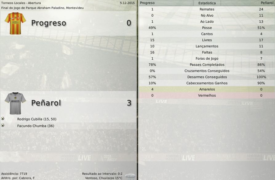 gq-tricolor Postado 28 de Novembro 2008 Autor Denunciar Postado 28 de Novembro 2008 Español | English | Português 9 de dezembro de 2015 A sede acabou, Peñarol! Mais uma goleada em casa dá título aos Carboneros 28 anos! Quase três décadas desde o último título internacional do Peñarol. E hoje, com Alvarado no comando o grupo de jogadores Aurinegros entrou para a história do clube. Foi o primeiro título da Sul-Americana conquistado por um time uruguaio. E o jogo em casa não podia ser diferente. Com certeza essa foi uma das viradas mais importantes da história do Peñarol. O primeiro gol da partida, marcado pelo New York serviu de motivação para o time de Montevideu. O fim do primeiro tempo serviu apenas para aumentar a tensão do jogo. Porque entre as duas etapas não houve quase nenhuma diferença. O jogo foi um toma-lá-da-cá geral. Do início ao fim. Ibarra e Chumba foram os heróis da final. Assista ao jogo O resultado global: Estatísticas Jogadores Estatísticas Equipes Peñarol 1 x 2 Nacional - Chumba / Campos e González Centenario, Montevideu Copa Sul-Americana New York 1 x 1 Peñarol - Núñez / Lavandeira Red Bull Park, Harisson (NJ) Progresso 0 x 3 Peñarol - Cubilla(2) e Chumba Abraham Paladino, Montevideu Copa Sul-Americana Peñarol 5 x 1 New York - Ibarra(2), Chumba(2) e Esterilla Centenario, Montevideu Citar