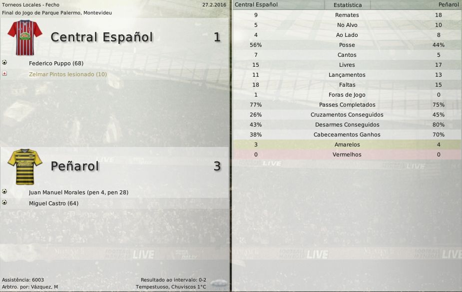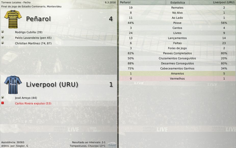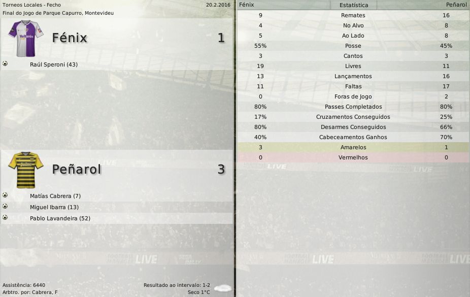 gq-tricolor Postado 29 de Novembro 2008 Autor Denunciar Postado 29 de Novembro 2008 Español | English | Português 19 de dezembro de 2015 Vitória sobre o Juventud garante o Apertura "Jogaremos a Libertadores com mais tranqüilidade" - Alvarado Não foi fácil como se imaginava esse fim de primeiro turno. O Nacional seguia na cola do líder Aurinegro a apenas três pontos. Essa diferença se alterou para seis após a última rodada, quando o Nacional perdeu a primeira partida após 25 jogos no Uruguaio. O Peñarol venceu fora de casa e assegurou o título simbólico do Apertura. "Esse era o objetivo, como na temporada passada, o título do Apertura vai dar tranqüilidade para jogarmos no segundo semestre. Porém essa será diferente. Disputaremos a Libertadores da América. Vamos em busca do título sul-americano, mas não esqueceremos do nacional" - lembrou Alvarado. Peñarol 4 x 1 Huracán Buceo - Lavandeira, Cubilla(2) e Sardella / Lacerda Centenario, Montevideu Juventud 0 x 2 Peñarol - Esterilla(2) Heptacampeão! O Grêmio, agora sob o comando do argentino Andrés Gugliempietro, segue impossível no Brasil. É o quinto título nacional em menos de nove anos. O Racing Club conquistou o título argentino na última rodada, dando um salto da terceira posição para a tão estimada liderança. Finalmente o Barcelona pode soltar o grito de campeão mundial. Pela primeira vez o clube catalão conquistou essa façanha, sem facilidades aliás. O São Paulo jogou de igual para igual com o último campeão europeu. Citar