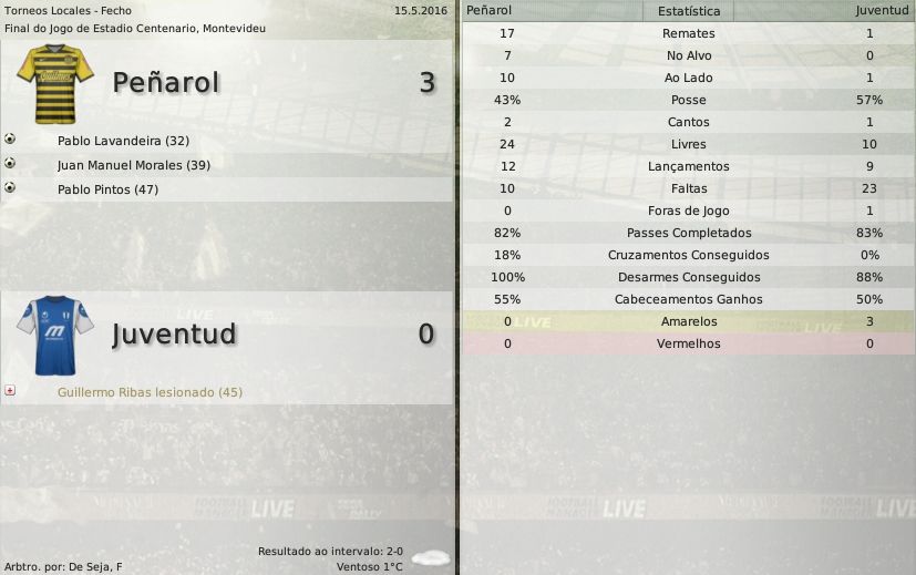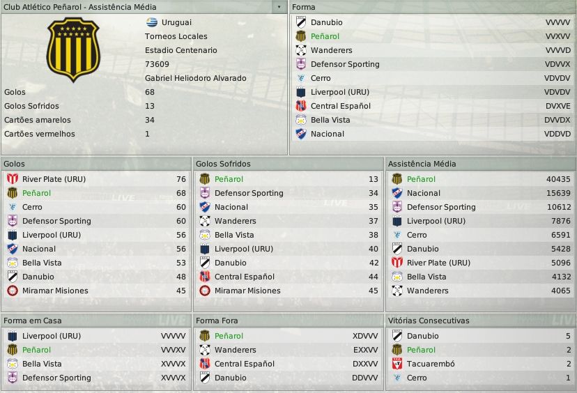 gq-tricolor Postado 5 de Dezembro 2008 Autor Denunciar Postado 5 de Dezembro 2008 Español | English | Português 7 de maio de 2016 Bicampeão Uruguaio É o 44º título nacional do Peñarol Se alguém achava que o Peñarol vacilaria nos três últimos jogos, devido à disputa da Copa Libertadores, se enganou. Os Carboneros fizeram hoje o que não conseguiram fazer na rodada anterior: bater um clube que recém subiu sendo claramente favorito para sair com a vitória. Contra o Progresso o Peñarol, com um time misto, amargou um empate em casa e deixou tudo para as duas rodadas finais. E hoje veio a consagração. O segundo título uruguaio de Alvarado no Peñarol foi conquistado de um jeito que ninguém pode contestá-lo. O melhor time disparado do certame nacional goleou o Huracán Buceo fora de casa e agora festeja o bicampeonato consecutivo e o 44º em toda a história. Confira como ficou a classificação após a 14ª rodada do Clausura: O título já tem dono, mas a última vaga para a Liguilla continua indefinidada. E são quatro concorrentes por uma chance de disputar a competição nacional que dá vaga à Libertadores. Citar