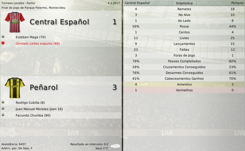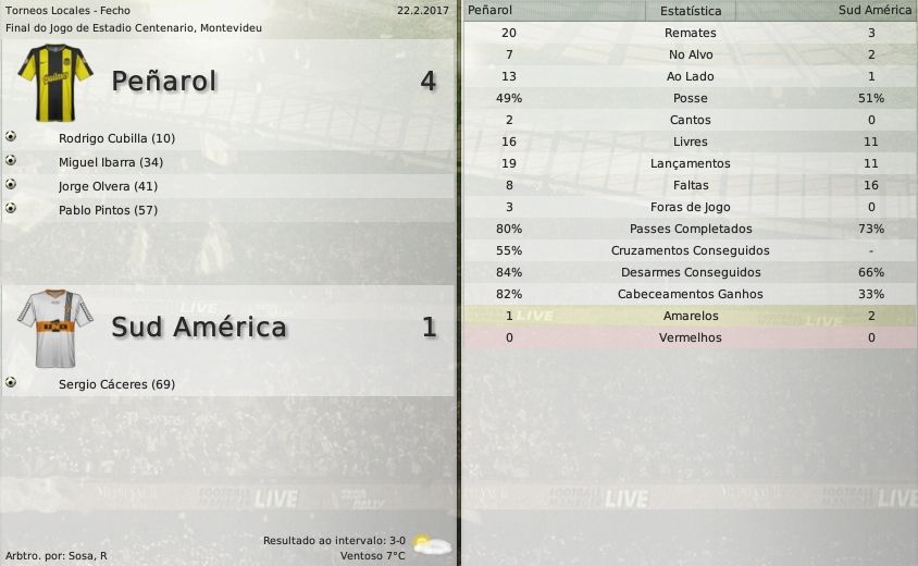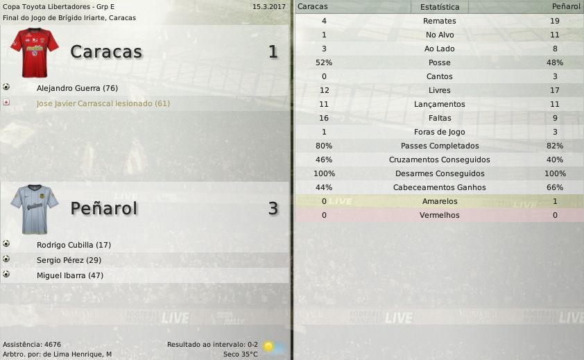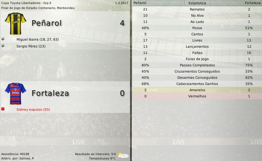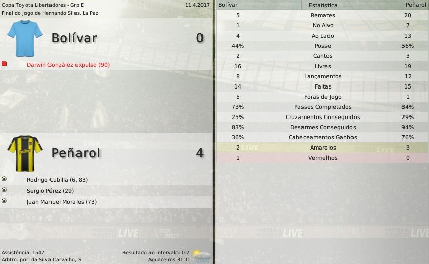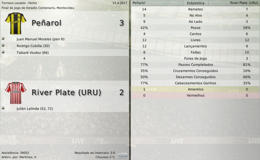 gq-tricolor Postado 13 de Dezembro 2008 Autor Denunciar Postado 13 de Dezembro 2008 Español | English | Português 22 de março de 2017 Disputa para ser o melhor primeiro Seis times lutam por vantagem nas fases seguintes da Libertadores Grêmio, quatro vezes campeão da Libertadores, River Plate, 3 vezes campeão, Racing Club, uma vez, Peñarol, seis vezes, Santos, duas vezes e Botafogo, uma, são os candidatos ao primeiro lugar geral na primeira fase da Libertadores. Uma vez que esses clubes dificilmente sairão do posto de primeiro lugar de seus respectivos grupos, outros apenas querem garantir um bom segundo lugar para não ter que enfrentar os poderosos primeiros-primeiros lugares. O Peñarol segue no embalo das vitórias. Nessa temporada os Carboneros só perderam para o Grêmio e para o Arsenal, ambas as partidas eram de finais de competição, Sul-Americana e Mundial respectivamente. Hoje a vítima dos Manyas foi o clube boliviano da cidade de La Paz, o Bolívar. A luta do Peñarol é contra si mesmo. Terão que somar o maior saldo de gols da competição para obter a vantagem de jogar os jogos decisivos do mata-mata em casa. Cerro 2 x 4 Peñarol - García e Martínez / Morales, González(2) e Cubilla Luis Tróccoli, Montevideu Peñarol 4 x 1 Sud América - Cubilla, Ibarra, Olvera e Pintos / Cáceres Centenario, Montevideu Peñarol 0 x 0 Wanderers Centenario, Montevideu Copa Libertadores Peñarol 4 x 0 Fortaleza - Ibarra(3) e Pérez Centenario, Montevideu Central Español 1 x 3 Peñarol - Maga / Cubilla, Morales e Chumba Parque Palermo, Montevideu Peñarol 2 x 1 Danubio - Morales(2) / Espino Centenario, Montevideu Copa Libertadores Caracas 1 x 3 Peñarol - Guerra / Cubilla, Pérez e Ibarra Brígido Iriarte, Caracas Peñarol 2 x 0 Defensor Sporting - González e Morales Centenario, Montevideu Copa Libertadores Peñarol 4 x 0 Bolívar - Cubilla, Sanguinetti, Morales e Pérez Centenario, Montevideu Citar