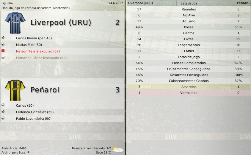 gq-tricolor Postado 17 de Dezembro 2008 Autor Denunciar Postado 17 de Dezembro 2008 Español | English | Português 28 de junho de 2017 O melhor da América Peñarol só falta alcançar o topo do mundo O Peñarol conquistou segundo título consecutivo da Libertadores e agora é hepta. O Independiente enfim ganha uma companhia e deixa de ser o único com sete títulos da Copa Libertadores da América. Por mais um ano a América é amarela e preta sem qualquer mancha, pois o clube uruguaio venceu a Copa Sul-Americana também e é favoritíssimo para a próxima. Falta a cereja do bolo, o Mundial Interclubes. Calor de 34ºC no jogo em casa A vitória incontestável do Peñarol no Rio de Janeiro a 34ºC serviu de base propulsora para o sétimo título dos Carboneros. Em diversos jornais brasileiros as manchetes esportivas questionavam querendo saber, com muita ironia, se o jogo, para os Aurinegros, era fora de casa mesmo. No Engenhão o Botafogo deus apenas cinco chutes a gol enquanto que os seus adversários bombardearam o gol do arqueiro Renan com vinte e quatro finalizações. O clube uruguaio parecia desesperado a partir dos 75'. Buscavam o gol mas ele não saía. E veio do jeito mais imprevisível. Além de um pênalti negado, discutível, o Botafogo sofreu um baque mais forte. Carlos, que entrara no lugar de González (substituto de Ibarra, lesionado), ia com a bola e percebeu Cubilla entrando pela diagonal do lado direito da área dos Alvinegros e quando tocou na bola em intensão de passar para o atacante oriental este estava em posição irregular mas o auxiliar não viu nada e nem o árbitro. Cubilla só teve o serviço de tirar do goleiro e marcar o gol do jogo. "Um passo gigantesco para conquistar a Libertadores" - afirmou o técnico do clube Aurinegro. O outro passo 11ºC em Montevideu. 73608 torcedores presentes no Centenario. A festa começou antes do jogo nas arquibancadas do estádio. A massa amarela e preta pulando sem parar, fazendo o chão de concreto tremer. "Estarei na história do clube assim que acabar o jogo" - declarou otimista o atacante Rodrigo Cubilla, autor do gol lá no Rio de Janeiro. Ele já estava na história, já tinha vencido a Libertadores com o Peñarol ano passado marcando três dos quatro gols da final contra o Grêmio. Foi outra vez decisivo. Sem o seu companheiro Ibarra dessa vez o uruguaio recebeu a companhia do argentino Federico González. 28': Mathías Morales passou bonito pelo lateral-direito do Botafogo Jefferson e foi à linha de fundo; cruzou a bola nos pés de González; o argentino chutou prensado e a bola sobrou para Cubilla marcar o seu segundo na final e o nono na competição tornando-se assim o artilheiro isolado. 35': González sofre pênalti. O volante Rever obstruiu o atacante Carbonero dentro da área; Juan Manuel Morales pegou a bola e bateu do jeito que só ele sabe bater; cobrança perfeita; segundo gol do Peñarol. 45': Antes do término do primeiro tempo o Botafogo diminuiu. Numa rápida jogada a bola chega até Carlos Antônio. O atacante botafoguense invadiu a área, escolheu o canto certo e bateu sem chances para Gómez Gómez. O Botafogo ainda teve um jogador expulso por agressão. A festa tomou conta do Centenario. Ao apito final a multidão cantou o nome de cada jogador do elenco Aurinegro, este se apresentava à torcida e atirava sua camisa. Parecia algo ensaiado. O momento em que a torcida gritava estridentemente o nome do seu técnico emocionou profundamente Don Gabriel Heliodoro Alvarado. Eles silabavam seu nome, gravado eternamente nos corações desses torcedores, e ele agradecia com gestos perdidos e com lágrimas nos olhos. O dia em que Alvarado chorou vai ficar marcado. Defensor Sporting 0 x 1 Peñarol - Pablo Pintos Luis Franzini, Montevideu Peñarol 3 x 1 River Plate - Chumba(2) e Cubilla / Lalinde Centenario, Montevideu Copa Libertadores Botafogo 0 x 1 Peñarol - Cubilla Engenhão, Rio de Janeiro Liverpool 2 x 3 Peñarol - Rivera e Mier / Carlos, González e Lavandeira Belvedere, Montevideu Copa Libertadores Peñarol 2 x 1 Botafogo - Cubilla e Morales / Carlos Antônio Centenario, Montevideu Grandes destaques tivemos nessa temporada: Juan Manuel Morales, Cubilla, Ibarra, Nicolás Sánchez, Cabrera, Gómez Gómez (vendido ao Standard-BEL), Sanguinetti, Mathías Morales e Miguel Castro (vendido ao Chievo-ITA). A grande revelação foi o brasileiro Carlos autor de dez dos incontáveis 144 feitos na temporada 2016/2017. Citar