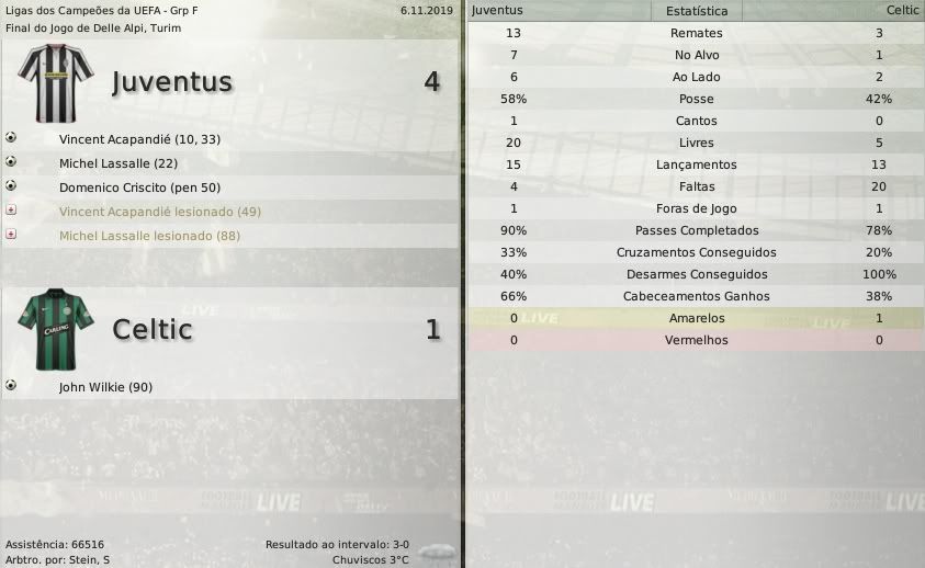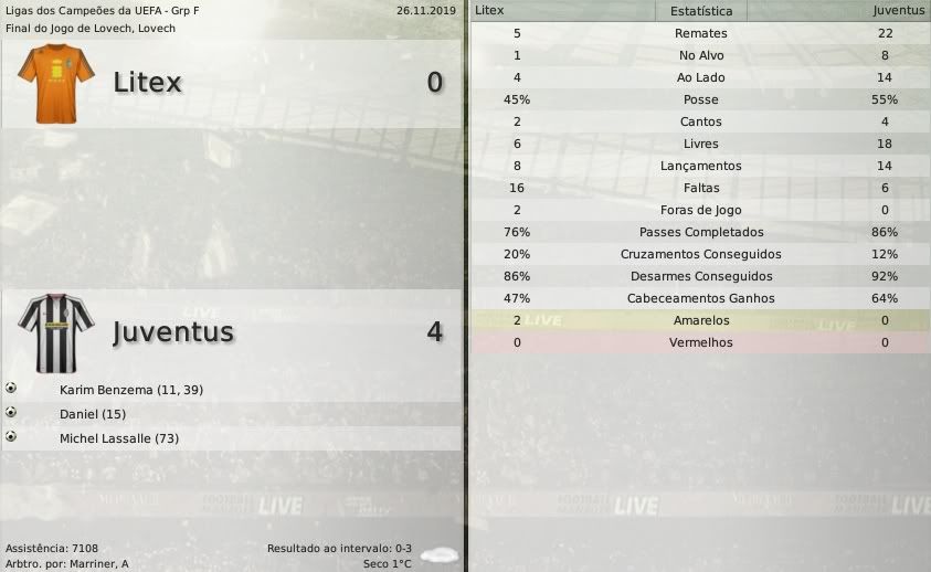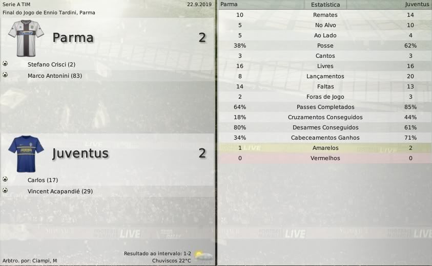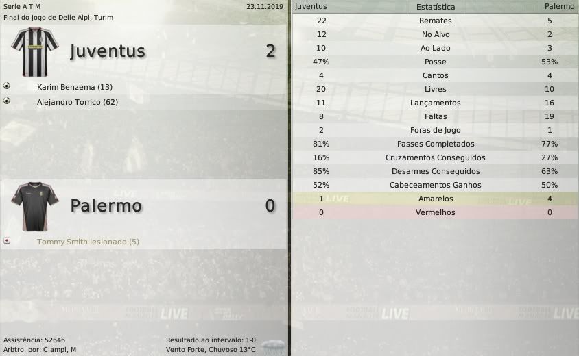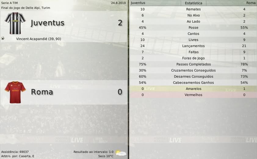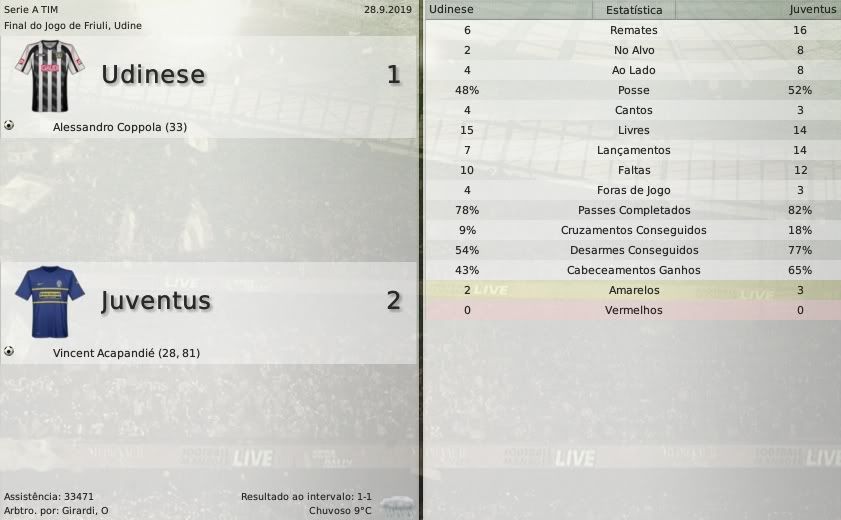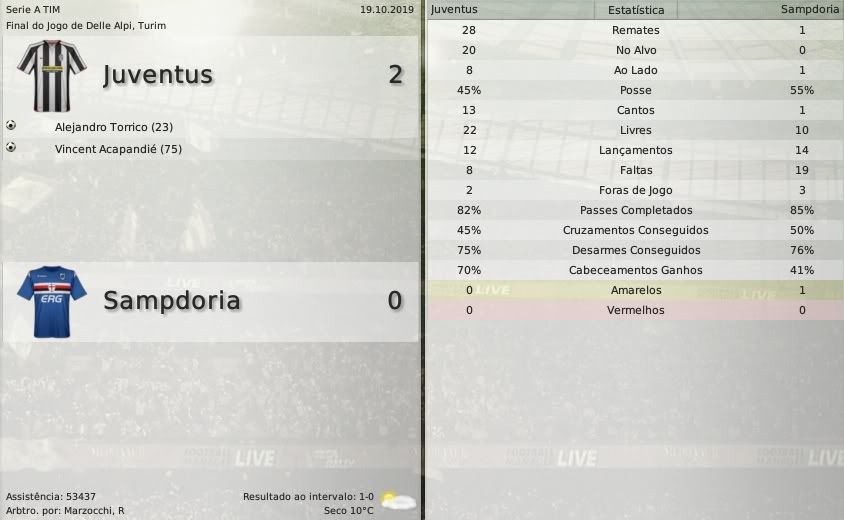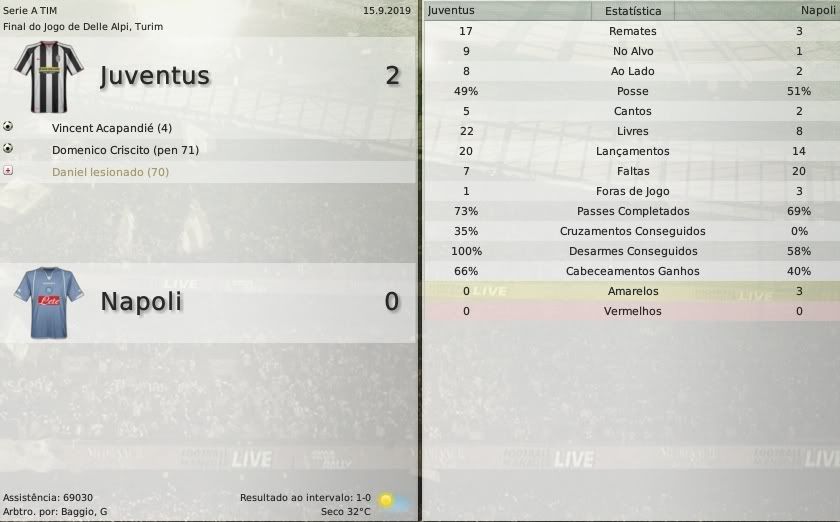 gq-tricolor Postado 26 de Janeiro 2009 Autor Denunciar Postado 26 de Janeiro 2009 Italiano | Español | English | Português 2 de novembro de 2019 Juventus humilha a Inter no Delle Alpi Time de Milão sofreu goleada histórica em Turim Pré-jogo Desde que chegou na Juventus, Alvarado fez seis jogos contra a Inter (não contando a partida de hoje) e não perdeu nenhum. Foram dois empates e quatro vitórias. Desempenho por desempenho a Inter do russo Stanislav Cherchesov não briga por um Italiano desde 2015 quando foi vice-campeã da competição. O jogo de hoje não tinha um favorito para vencer. A goleada 11': o primeiro gol foi marcado pelo belga Victor Payme. Fágner, novamente titular, cobrou a falta e a bola desviou na barreira; Carlos pega o rebote, vai até a linha de fundo e cruza a bola nos pés de Payme que chuta e marca o primeiro gol do jogo. 45' + 1': Nos acréscimos do primeiro tempo Acapandié sofre pênalti. O cobrador oficial do time, Criscito, cobra e a bola morre no canto direito do goleiro Carson. 56': Acapandie faz o seu primeiro no jogo. Depois de troca de passes envolvente, Vincent Acapandié recebe de Payme para fazer o terceiro gol da Juve. 62': Após tentativa de sair para o jogo a pressionada e envolvida Inter sofre outro revés. Carlos recebe a bola do volante Eduardo Ferreira e corre com a bola pelo meio. Ele descobre Acapandié livre dentro da área que só tem o serviço de tirar o goleiro do lance e marcar. 69': Sempre pelo meio a Juventus vai trabalhando a bola. Lassale entra na área da Inter olha para trás e vê Torrico desmarcado. A bola chega até o boliviano e ele chuta firme, na trajetória o esférico desvia no zagueiro Nerazzurri e engana o goleiro. Já é o quinto gol Bianconero. 81': Criscito cobra o escanteio no primeiro poste, jogada muito utilizada pela Juve, e Daniel se apresenta para o cabeceio. É a sexta vez que a bola entra. Fácil. 84': Para fechar a goleada, Benzema, que entrou no lugar de Acapandié, faz o seu primeiro gol na temporada. 7 a 0 e fim de papo no Delle Alpi. Pós-jogo Ao contrário de Alvarado que resolveu falar do jogo de forma contida, o russo Cherchesov nem falou com a imprensa após o desastre em Turim. Quem comentou sobre a derrota foram os atletas Nerazzurri. "Entramos de um jeito e saímos de outro" - disse Lulinha, meia titular da equipe de Milão. Carson, o goleiro, foi franco: "De novo estamos fora. Me sinto extremamente envergonhado". Além do clássico entre Juventus e Internazionale tivemos mais dois jogos na abertura da 11ª rodada nesse sábado. Com os resultados atuais a Juventus ultrapassou a Lazio devido ao saldo de gols e o Milan segue liderando isoladamente com 33 pontos, nove a mais que a Juventus e a Lazio. Citar