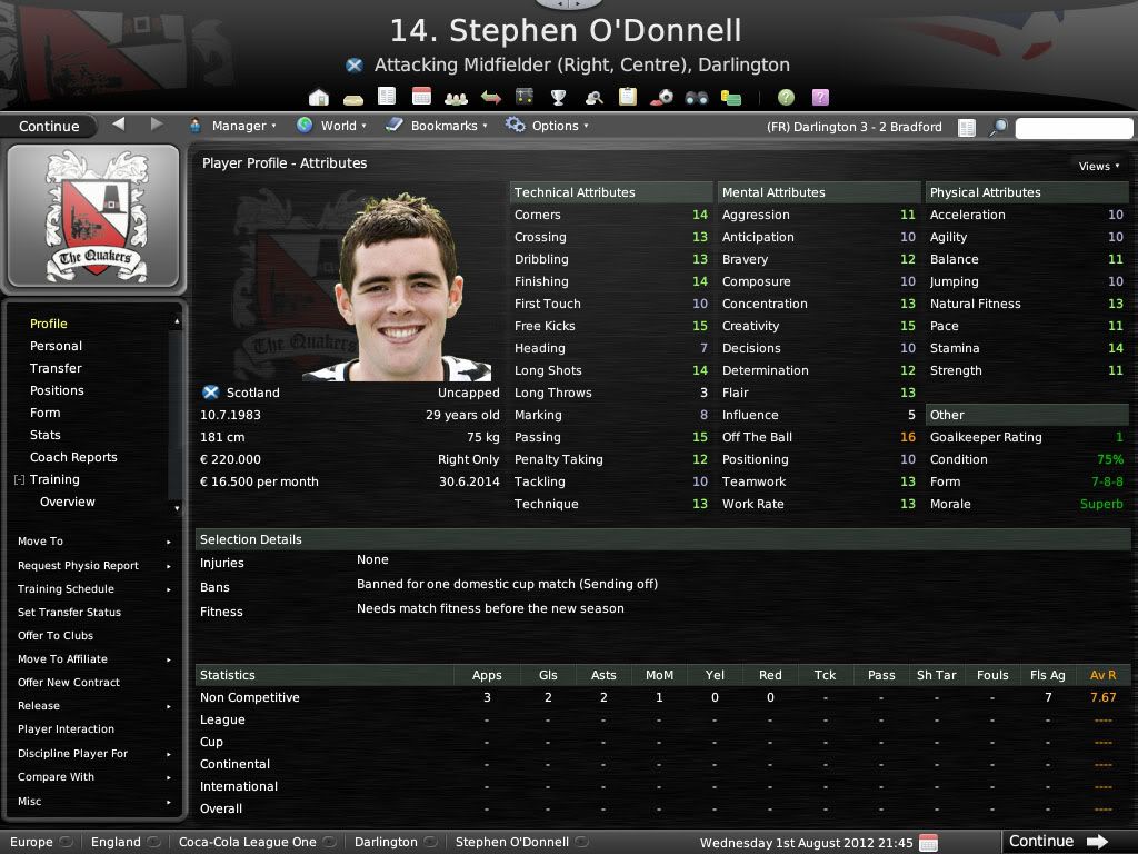 Vice-Presidente Henrique M. Postado 7 de Setembro 2008 Autor Vice-Presidente Denunciar Postado 7 de Setembro 2008 Meu nome começa a crescer na esfera das ligas superiores, tá certo que o clube que demonstrou o interesse direto em mim não é nenhuma superpotência do futebol, mas ao menos estava na 1ª divisão da sua liga e não tinha acabado de ser promovido. Eu recusei prontamente, pois não queria me perder em Portugal, já que ir para o Paços Ferreira seria um retrocesso igual ao aceitar a proposta do Bray Wanderes no ano anterior. O que importa é que isso me deixa animado para o futuro, se eu manter o ritmo, quem sabe logo, logo não estou na Premier. O mercado não foi tão movimentado quanto o do ano passado, mas fiquei feliz em constatar que as contratações que fiz no ano passado, ainda dão conta de jogar em alto nível na League One, tenho plenas esperanças de que posso manter o time, tanto é que foi isso que garanti ao presidente, não quis alçar vôos mais altos para não comprometer meu emprego, gosto do Darlington, me proporcionou boas emoções. As táticas mudarão um pouco, evoluimos do 4-4-2 Diamante, para um 4-3-3 disfarçado de 4-5-1 nos jogos em casa e para os jogos fora de casa, passamos do ultrapassado 4-5-1, para um 5-4-1 disfarçado de 3-6-1. Espero que dê tudo certo e essas táticas façam os jogadores arrebentarem, pois é isso que espero, acho que a última vaga para os playoffs não está tão fora de questão assim. Foram poucas entradas e poucas vendas, as saídas não teve nenhuma que rendeu dinheiro ao caixa do clube, apesar que ainda tenho 1 mês de mercado pela frente, mas eu não creio que eu vá vender ou contratar alguém nesse momento, a não ser que apareçam grandes propostas. Os nomes que destaco são os de Ian Evatt, um zagueiro experiente que vem para dar mais solidez para defesa, que ano passado era muito irregular. Para o meio chegou Stephen O'Donnell, creio que ele fará bem o papel de ligar a equipe, ainda mais somado com o talento de Dunn e de Togwell. E para o ataque, festejamos o retorno do maior artilheiro da história do clube em uma temporada e em uma competição, Jason White, espero que ele repita a brilhante campanha da temporada anterior e que faça gols decisivos novamente. Quanto aos amistosos, desconsiderem os 3 primeiros, são amistosos de praxe com nossos afiliados. O que me interessou mesmo foi o jogo contra o Bradford, adversário na League One e o jogou deu a idéia de que somos capazes de brigar por boas posições, já que o Bradford é cotado como um dos clubes de topo da tabela. Citar