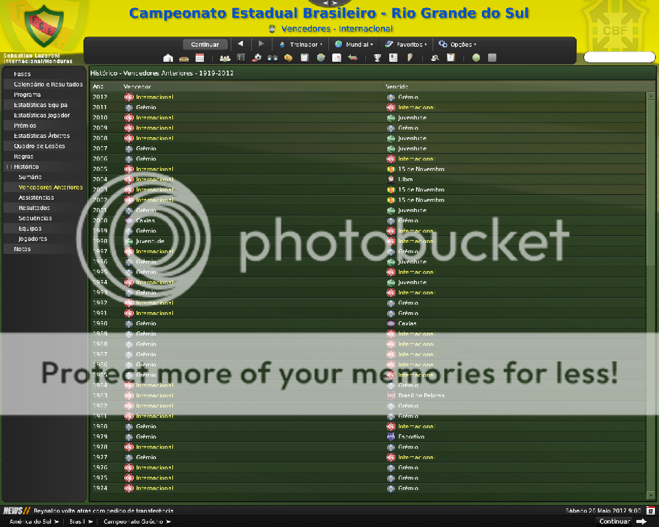 Jirimias Postado 2 de Fevereiro 2009 Denunciar Postado 2 de Fevereiro 2009 [ 23 de maio de 2012 Libertando o Internacional. Enfim posso ficar mais tranquilo, pois o Internacional começou a sair do papel.Já não falo de vitórias maiúsculas contra times minúsculos, mas vitórias minúsculas contra time maiúsculas. Premiação: Campeonato Gaúcho Fiquei feliz com o prêmio de Melhor Treinador do Campeonato Gaúcho de 2012, foi meu primeiro prêmio desde aquela fase dos anos 90.Um prêmio que divido com meus jogadores e com a equipe técnica. Internacional: Copa Libertadores da América Fase de grupos O confronto contra o Independente terminou empatado e acabou confirmando a nossa segunda colocação no grupo.Ali começávamos a esperar por confrontos piores nas fases eliminatórias Oitavas de final O nosso primeiro adversário era o Botafogo.Da última fez que nos confrontamos, eu estava do outro lado, e era impossível negar a rivalidade que havia tomado contado do confronto por minha saída do clube.No primeiro jogo contra o Botafogo, a vitória veio sofrida apesar de merecida, tivemos o Miranda expulso o que deixou a aprtida um pouco dramática. No segundo jogo contra o Botafogo tive o desprazer de constatar o bom momento de Zalayeta, totalmente adaptado ao futebol brasileiro.O uruguaio marcou o gol que deixava a série empatada. Porém éramos superiores, só falta o gol, que não faltou mais quando Willian Santana apareceu no segundo poste para empatar a partida de cabeça.Tivmeos também mais uma expulsão, por sorte não nos trouxe maior problema.Na fase sguinte ,era hora de pagar pela segunda melhor campanha no nosso grupo, enfrentaríamos o Boca Jr. Quartas de final Recebemos o Boca Jr. e mostramoso nosso melhor.Era impossível contar nos dedos a quantidade de chances perdidas, perdemos a chance de fazer uma goleada histórica, ou pelo menos de construir uma boa vantagem para o segundo jogo.Mas deixando de lado as lamentações, ter vencido com um gol aos 37 minutos do segundo tempo já ficou de bom tamanho.Não sofrer gols em casa é uma vantagem e tanto na Libertadores. A segunda partida confirmou o nosso bom momento, ainda falta a pontaria certeira, mas os resultados estão vindo.O segundo jogo contra o Boca além de nos apresentar superiores, foi uma prova de fogo para o meu 4-3-3.O Boca Jr. não aprendeu a lição e novamente colocou um meio-campo lotado de jogadores e isolou Palácios, resultado:Palácios sumiu! Vencemos com mais um gol de Sóbis e um gol do nosso zagueiro matador, Anderson Martins, vitória em plena La Bombonera. Próximos confrontos Pela frente só vemos argentinos, o River Plate será o nosso adversário, enquanto o Independente mede forças com o San Lorenzo. enviar a um amigo | postagens anteriores | recomendar este blog