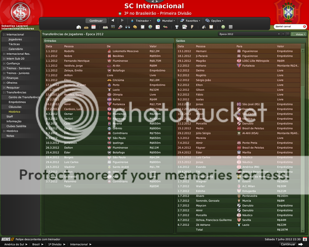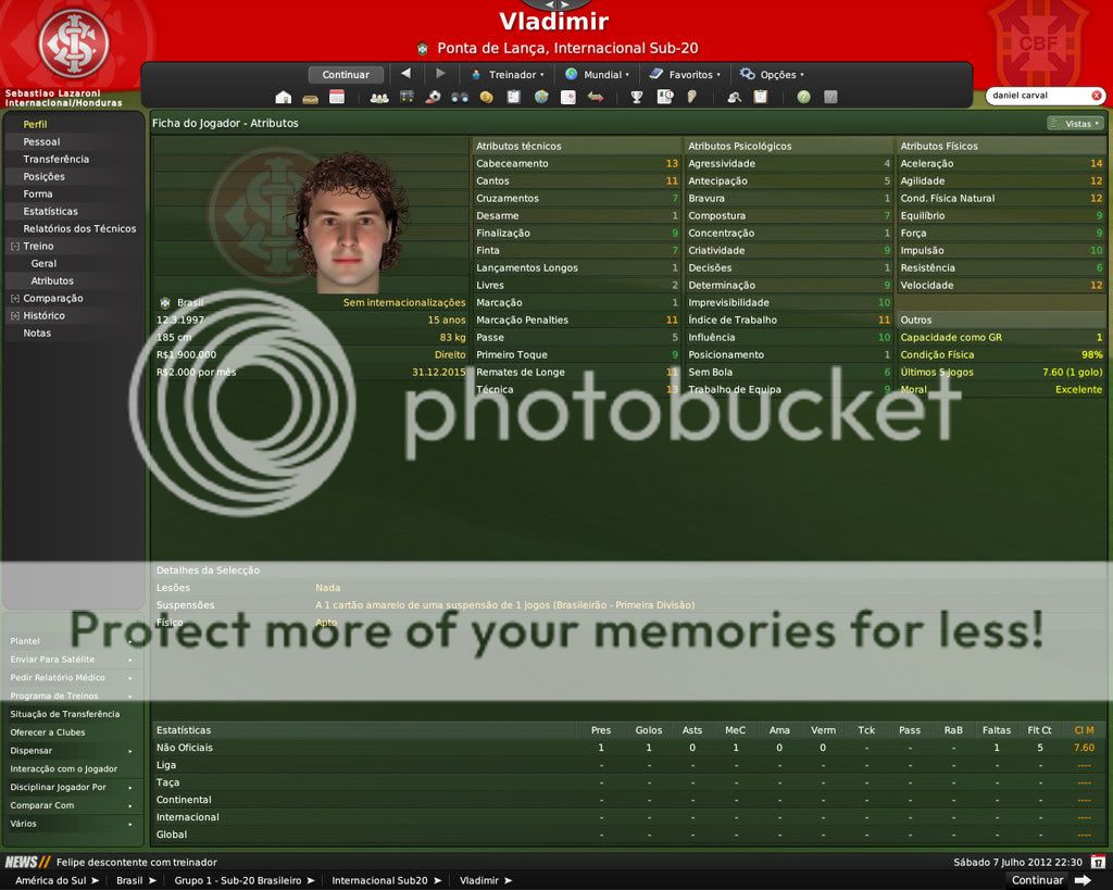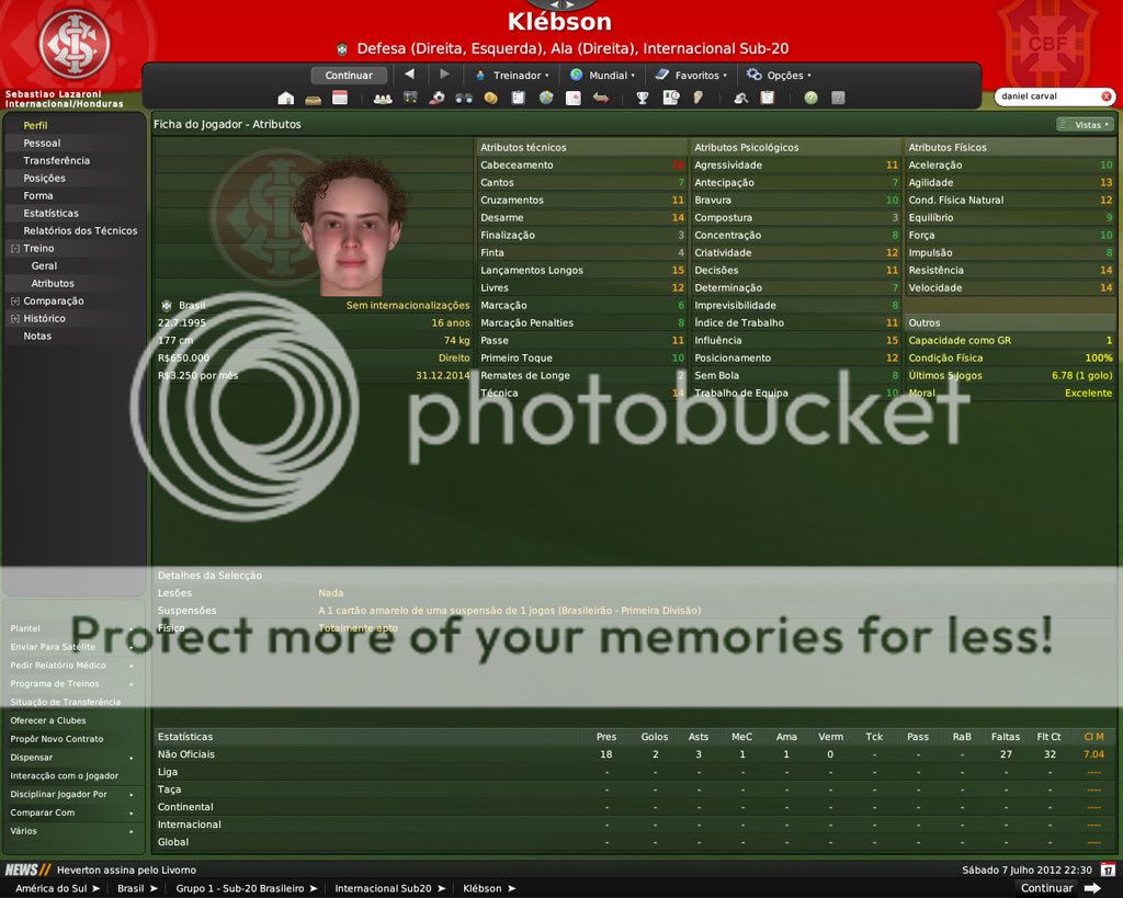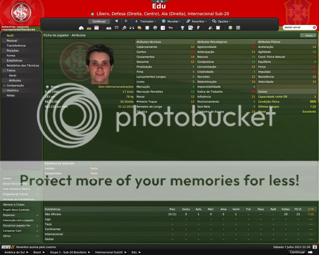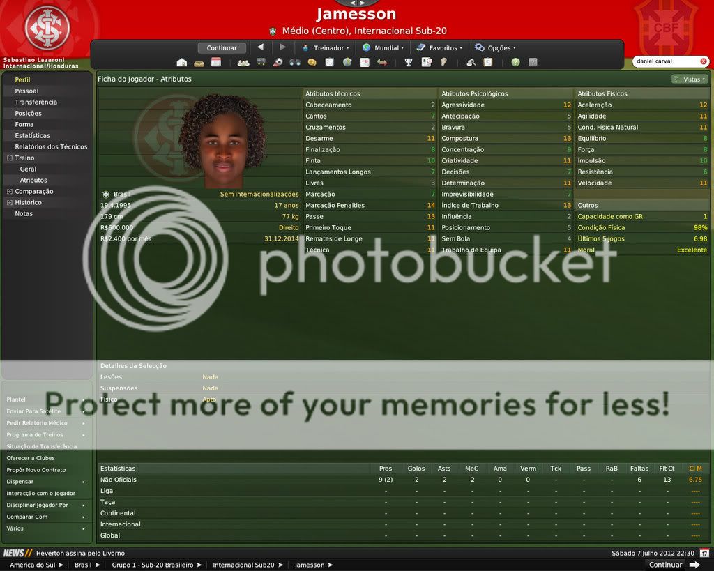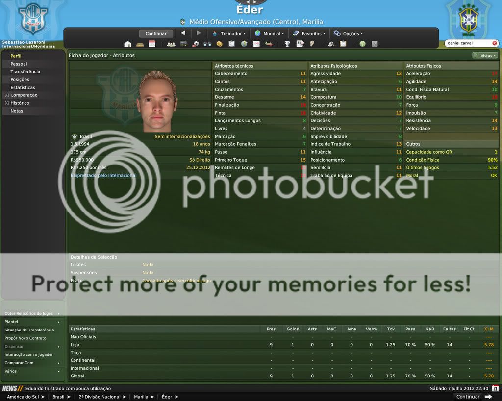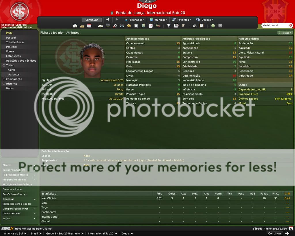 GG. Postado 7 de Fevereiro 2009 Denunciar Postado 7 de Fevereiro 2009 É difícil segurar os jogadores por aqui. Nisso o FM é bem realista. Por outro lado, o celeiro continua produzindo jogadores. De todos os que você contratou os que eu mais gostei foram o Edu e o Eder. Os outros vão precisar evoluir mais, porém são boas contratações também.