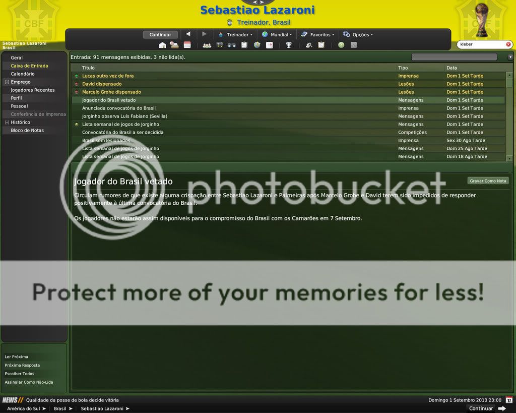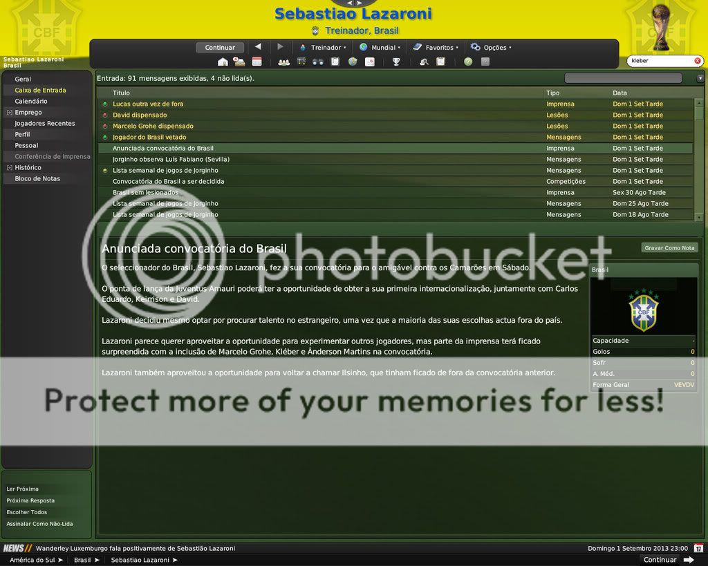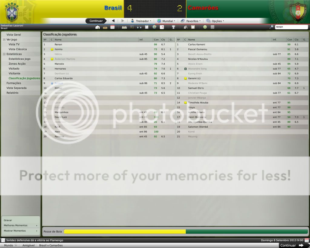Jirimias Postado 6 de Março 2009 Denunciar Postado 6 de Março 2009 08 de Setembro de 2013 Seleção,meu sonho. Desde o fracasso da Copa de 1990, alimento este momento.Chegar á Seleção para mim é a única forma de tentar apagar aquilo que passou há tantos anos mas ainda está presente.O amistoso contra Camarões foi o pontapé inicial neste trabalho... Resultados: Amistosos da Seleção Estatísticas | Escalação Camarões era teoricamente inferior, mas eu esperava mais de jogadores que deveriam mostrar o seu melhor na última chance que teriam de assegurar um lugar na Copa do Mundo. Por outro lado, fiquei muito feliz de ver confirmada a estrela de Amauri, o atacante que nunca havia sido convocado mostrou que está pronto para assumir a responsabilidade de ser o homem de área na Copa do Mundo O capitão da Juventus Amauri fez o primeiro marcando um belo cabeceamento da zona de penalti logo aos 5 minutos. Hernanes aumentou aos 45 minutos com um chute de fora da área que desviou na zaga de Camarões.Um erro de Alexandre Song permitiu ao Ilsinho marcar um potente remate à entrada da área.Ilsinho confirmou também pela seleção o bom desempenho no Internacional. Segundo tempo começou com gol de Amauri aos 3 minutos, e depois o Brasil acabou cedendo espaço para os visitantes: Samuel Eto'o reduziu o placar pelos Camarões aos 54 minutos com um remate colocado.E aos 40 do segundo tempo o ponta de lança Henri Bienvenu conseguiu marcar segundo gol de Camarões com oportunismo. Após o jogo tirei algumas dúvidas sobre jogadores que atuavam no Brasil e outros jogadores que vinha se destacando fora, a partir de agora acompanharei o desempenho desses jogadores e de outros que vinham jogando na seleção para formar o time da Copa do Mundo. Postado por Lazaroni em 08 de setembro de 2013 enviar a um amigo | postagens anteriores | recomendar este blog