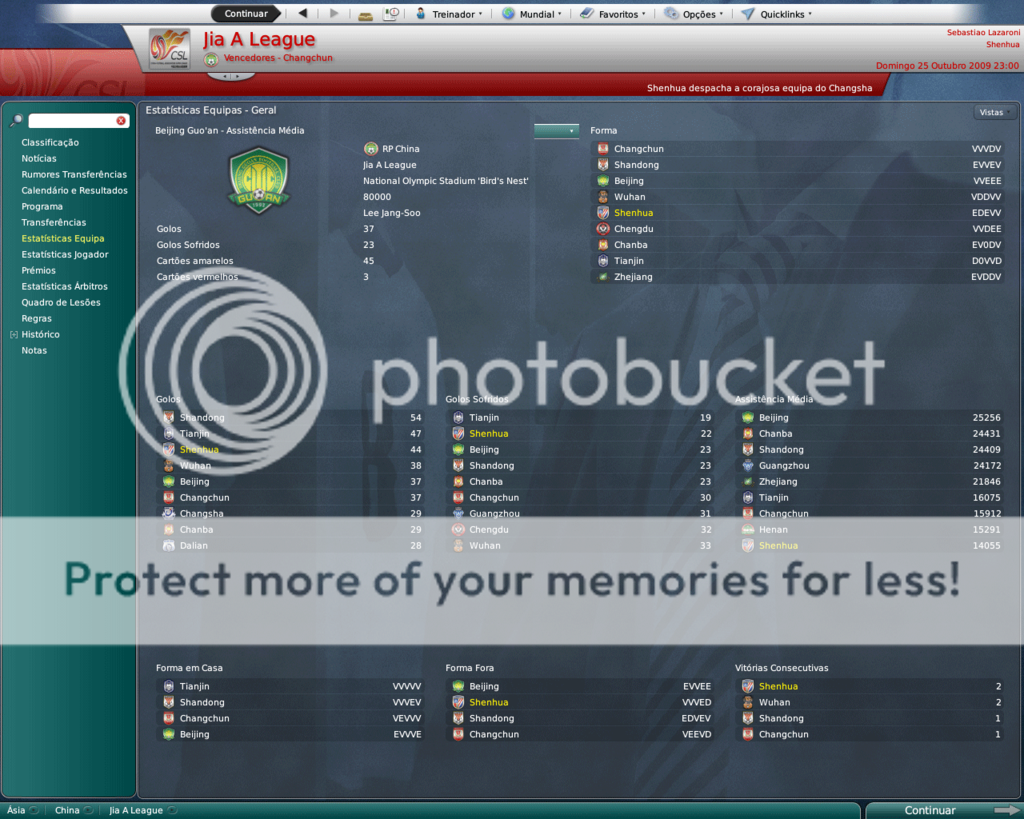 Jirimias Postado 26 de Dezembro 2008 Denunciar Postado 26 de Dezembro 2008 Shanghai Shenhua 3 - 1 Changsha Ginde (CSL) Público: 11292 O Shanghai Shenhua conseguiu bater em uma partida difícil a equipe do Changsha Ginde em jogo da Superliga Chinesa disputado no Hongkou Stadium esta tarde. Os dois golos de Hamilton Ricard foram decisivos para a vitória do Shenhua. O Changsha finalmente passou para a frente quando o médio Sandro marcou um remate colocado de longe aos 45 minutos. O médio-ala Sun Xiang igualou depois o placar pelo Shenhua aos 53 minutos com uma cobrança de falta da entrada da área. Um erro de Zhang Ke permitiu depois ao ponta de lança veterano Hamilton Ricard marcar um remate colocado. Ricard completou a lista de marcadores do Shenhua com um remate colocado aos 66 minutos. Após o jogo os torcedores foram surpreendidos por uma notícia vinda do vestiário: o treinador Sebastião Lazaroni acabava de pedir demissão do cargo de treinador do Shenhua alegando estar passando por problemas pessoais que o forçaria voltar ao Brasil.Hoje pela manhã o treinador oficializou sua saída há dois meses do fim de seu contrato com uma rápida entrevista: "- prefiro pedir para sair do que fazer o clube pagar pela minha falta de motivação". "- volto para o Brasil desempregado". "- tudo influenciou na minha decisão desde estes meu problemas pessoais à eliminação na Fuji Film e a queda do desempenho da equipe na CSL." "- é com o coração apertado que digo que não merecíamos o título nacional." "- tive muitas boas propostas mas recusei porque queria dar um título ao Shenhua, não consegui,mas espero um dia voltar." Últimos Resultados: Uma explicação: esse lance de ter jogado tudo de novo por causa do crash dump me desmotivou completamente a continuar na China, até gostei de jogar no país, e até penso em voltar,mas continuar estava difícil , o título ficou bem complicado depois que perdi a partida seguinte a este post.Com o fim do campeonato Brasileiro, está surgindo uma oportunidade, algo que qualifico como o maior desafio de toda a minha vida de futebol manager, onde terei que vencer o pior dos meus adversários: eu mesmo. :lol: Em breve eu conto.