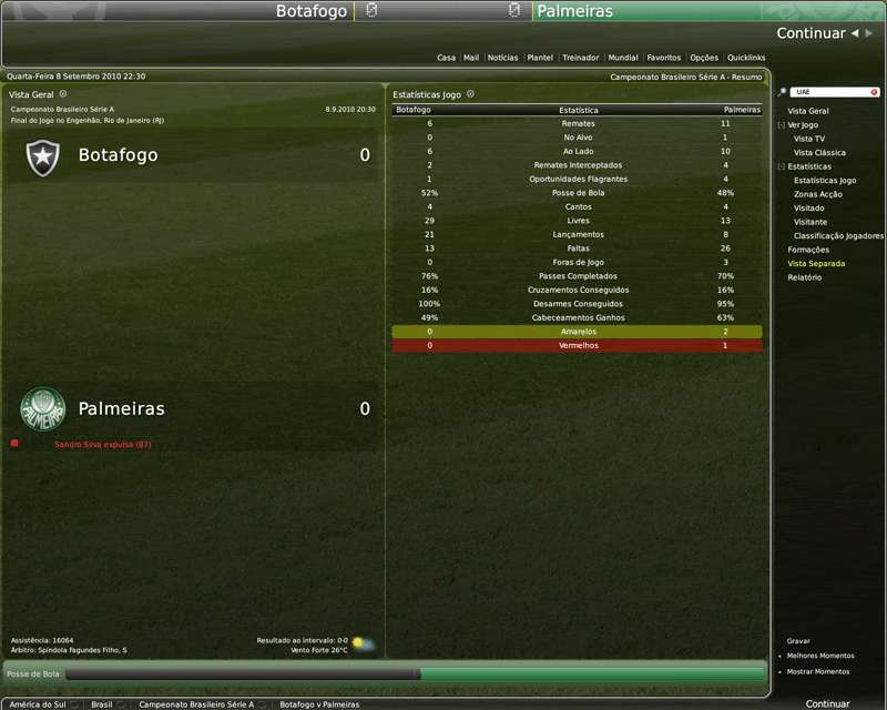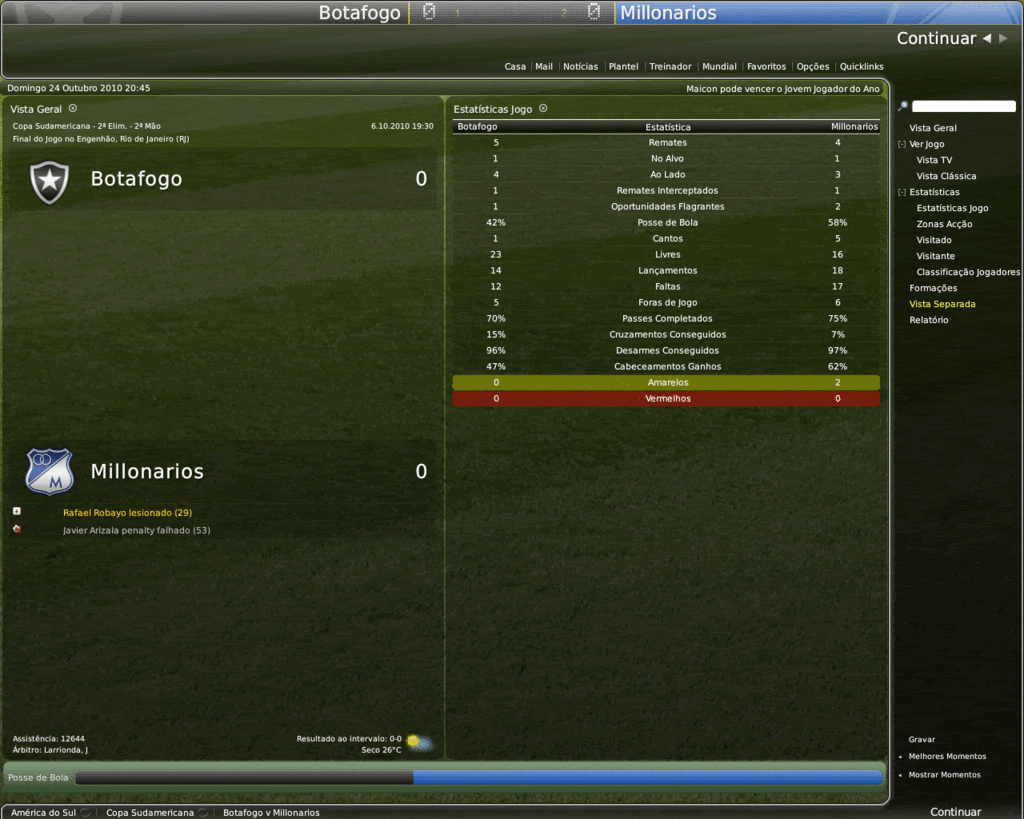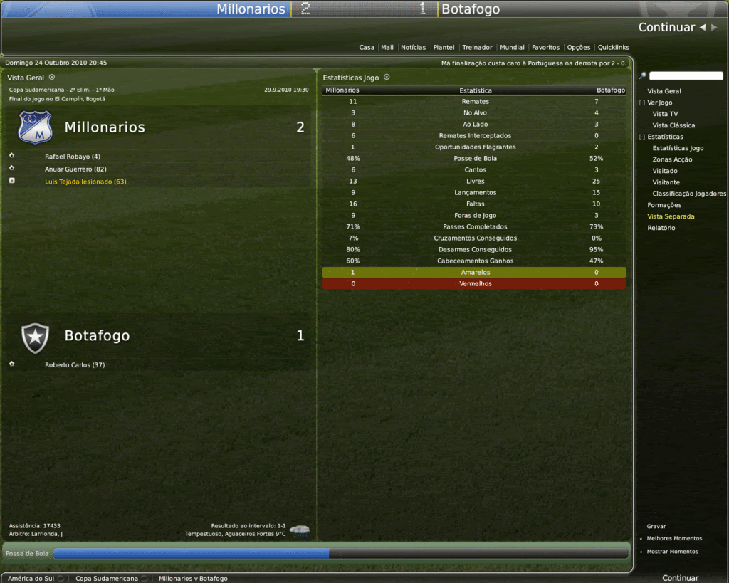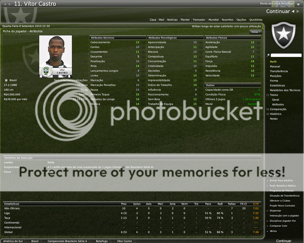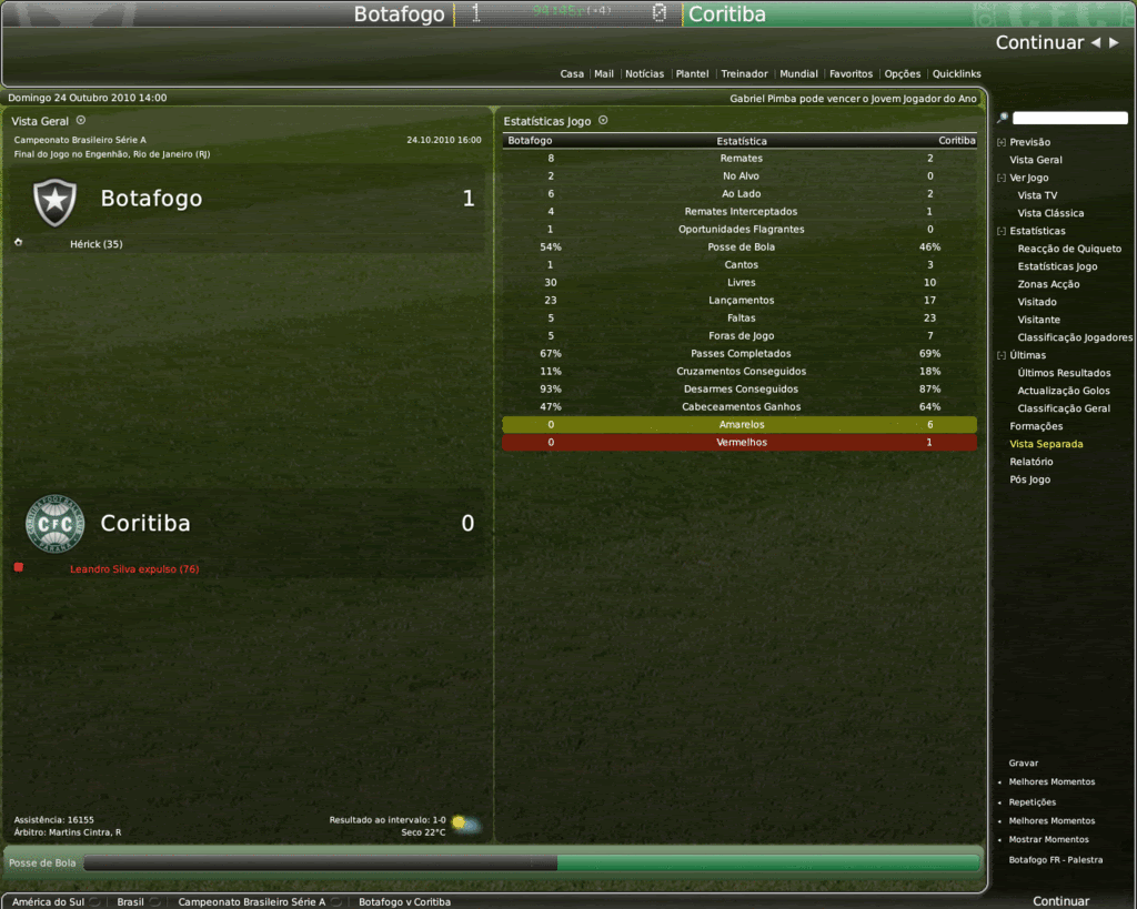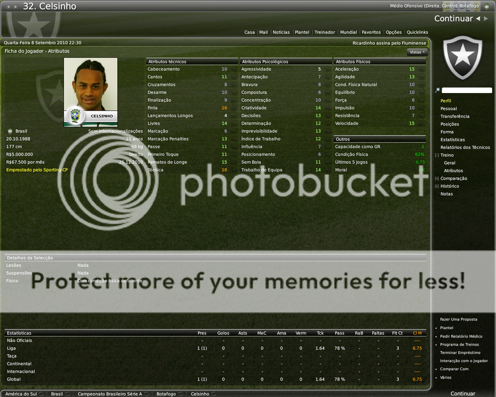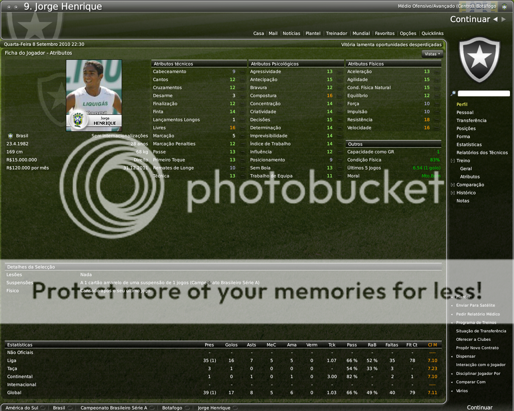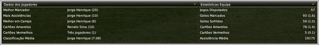 Jirimias Postado 5 de Janeiro 2009 Denunciar Postado 5 de Janeiro 2009 01 de outubro de 2010 Resumo. Depois de muitas turbulências, o Botafogo se mostrou forte e está de pé.Ainda existe um alerta financeiro, mas felizmente o clube já não está nas mãos dos seus credores. Dentro do campo, confesso que estou bem decepcionado com o rendimento da equipe, não está ruim,mas a equipe tem potencial para mais.Pelos números abaixo dar para fazer um raio X da situação da equipe.Em resumo: defesa forte, ataque quase inofensivo; o melhor atacante é o meia-atacante Jorge Henrique. Algumas anotações sobre o elenco: O grupo ainda não está entrosado, mas já era esperado devido às muitas mudanças ocorridas no plantel em decorrência do desmanche.Desde o início do Brasileiro procuro um atacante que substitua Wellington Paulista à altura e isso tem sido muito difícil.Nomes como Ronaldo e Kleber Pereira não fizeram nada em suas passagens no cluibe, Ronaldo dispensado por três lesões em um mês e Kleber Pereira não fez um gol sequer em 4 partidas que disputou. A dupla de argentinos não repete o bom início, mas creio que eu tenha alguma culpa nisso, já que separei a dupla para encaixar o Jorge Henrique no ataque. Análise de alguns jogadores: Thiago Prado: gosta de sair jogando, segura muito a bola na defesa, já perdemos jogos com seus erros.Uma boa solução que eu encontrei para ele foi usá-lo em determinados jogos como um líbero, chegando ao ataque e surpreendendo; logicamente é um pouco suicida,mas faz sentido em jogos que não se tem muito a perder. Eduardo: o lateral esquerdo anda fazendo partidas espetaculares, dificilmente continuará no clube no próximo ano devido ao forte interesse dos clubes do exterior.Jogada forte: chegar na linha de fundo. Pablo Mouche: há jogos não joga bem, estive repensando sua continuidade no clube. Edson Bastos: esforçado, mas me faz sentir saudades de Renan. Jorge Henrique: não existe Botafogo sem Jorge Henrique, o grande nome desse time. Vitor Castro: pediu para sair por não ter oportunidades, mas ganhará uma oportunidade tendo em vista a falta de inspiração de Tadeu e Edgar. enviar a um amigo | postagens anteriores | recomendar este blog ... Postagens anteriores Um velho freguêsBrasileirãoReforços ... 30 de setembro de 2010 Um velho freguês. Nossa participação na Copa Sul-Americana teve um gosto especial para os botafoguenses.Pela primeira eliminatória enfrentaríamos o rival Flamengo, para quem não perdemos neste ano.Na primeira partida contra o Flamengo, vencemos com tranquilidade por 2x0.O jogo também marcou a estréia de um novo esquema tático, que mais tarde descobri que só funcionava com o Flamengo, ou melhor, com equipes que dependem de seus laterais para atacar. No segundo jogo confirmamos a vaga para a próxima fase da competição com mais uma vitória, que poderia ser até de uma diferença maior de gols. Na próxima fase, enfrentaremos o Milionários. enviar a um amigo | postagens anteriores | recomendar este blog ... 10 de setembro de 2010 Brasileirão. Alguns pessimistas apontavam o Botafogo como candidato fortíssimo para cair, e parecem que se enganaram redondamente.A luta pela Libertadores é o nosso foco, aliás, é o foco da minha carreira para o ano que vem, seja no Botafogo, seja em outro clube. Depois de 20 rodadas estamos em 8º com 28 pontos. vitória sobre o São Paulo |vitória sobre o Cruzeiro | vitória sobre o Flamengo |empate com o líder Palmeiras. enviar a um amigo | postagens anteriores | recomendar este blog ... 08 de setembro 2010 Reforços. Podemos dizer que tivemos uma grande perícia com os reforços.Não é todo dia que se consegue bons nomes como Daniel Carvalho e o artilheiro Tadeu, ex- Figuerense, que estava no futebol árabe, além do grandalhão Edgar, que me motivou muito a criar um a tática "a inglesa" especialmente para ele. Para engrossar o caldo , ainda trouxemos Roberto Carlos, promessa de muitas bombas nas metas adversárias;Ronaldo, que estava esquecido no Flamengo, e Celsinho, aquele que para alguns era tido como novo Ronaldinho, mas quem é Ronaldinho mesmo? Confira aqui todas as transferências Andrey | Marcos Assunção | Maicosuel |Edgar | Roberto Carlos | Weldon | Daniel Carvalho | Ricardinho | Ramon | Celsinho | Tadeu | Alex Maranhão enviar a um amigo | postagens anteriores | recomendar este blog